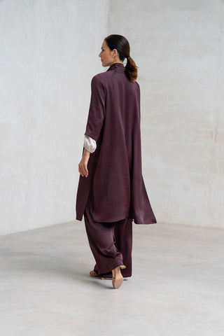 The Hiedra coat in burgundy combines structure and lightness in a garment that elevates any look with serene elegance. Its fluid fabric and wide silhouette gently hug the body, while the shirt collar and side slits balance form and function. Ideal for layering and textures, this coat is a versatile and timeless companion.