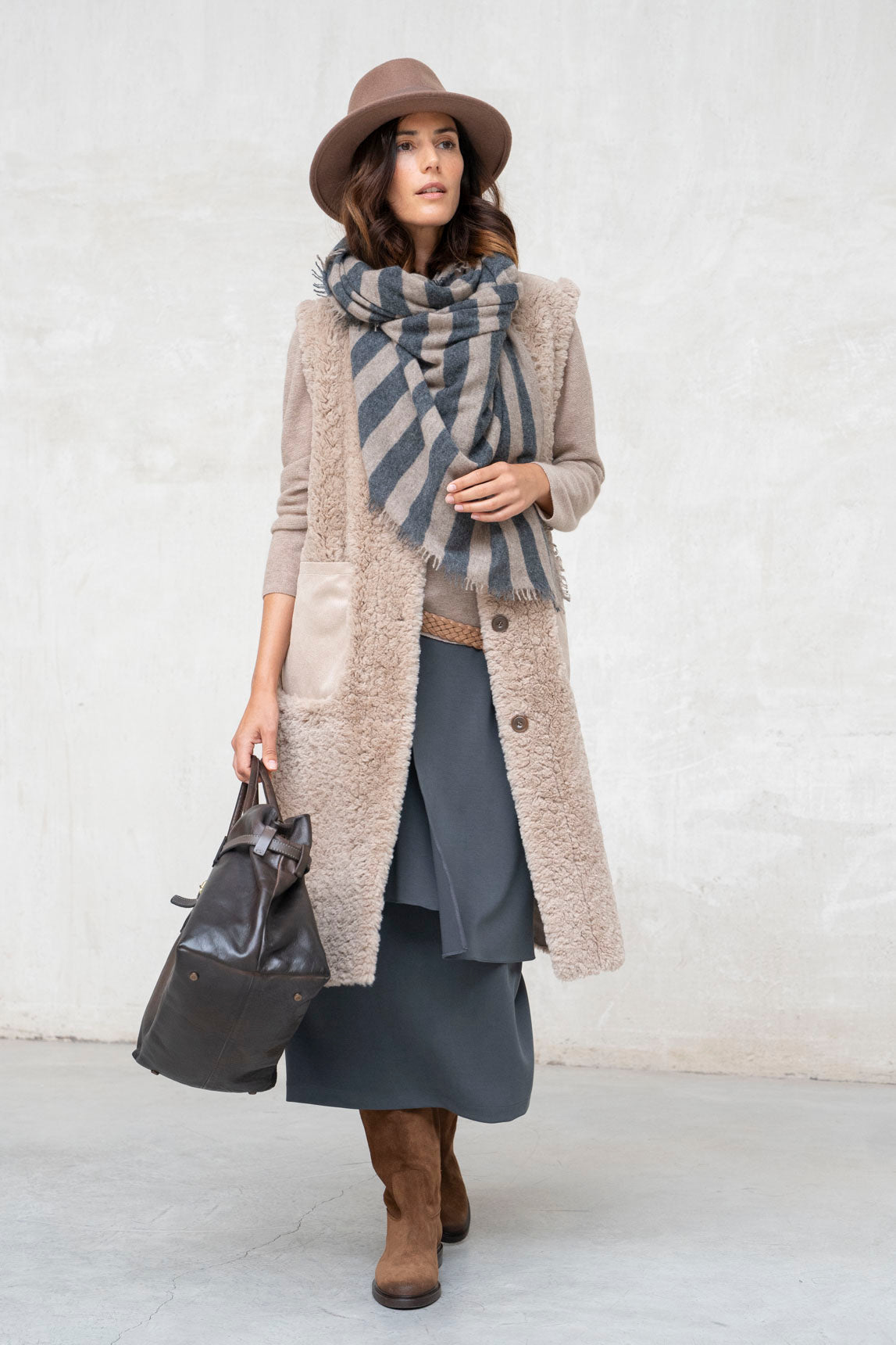 Add the Rivera gray striped scarf to your wardrobe, featuring a diagonal stripe design in anthracite gray and taupe. Made from cashmere fabric, it features a finish that provides comfort and a cozy feel for the colder months. The short fringed edges reinforce its casual and relaxed feel. Its neutral and understated palette makes it a highly versatile option, ideal for both urban styles and natural-inspired or casual-chic looks. A comfortable and versatile scarf, designed to accompany you every day with warmth and style.