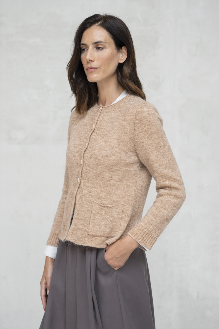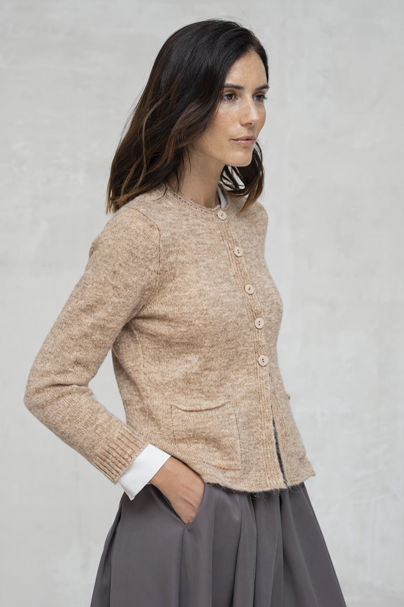 El cárdigan Sofi en camel jaspeado es una prenda imprescindible para sumar suavidad y estilo al armario. Su tejido de punto aporta textura, mientras que los botones a juego y los bolsillos delanteros lo convierten en un diseño cómodo y fácil de llevar. Perfecto para combinar con básicos diarios o para añadir una capa elegante en looks de entretiempo.