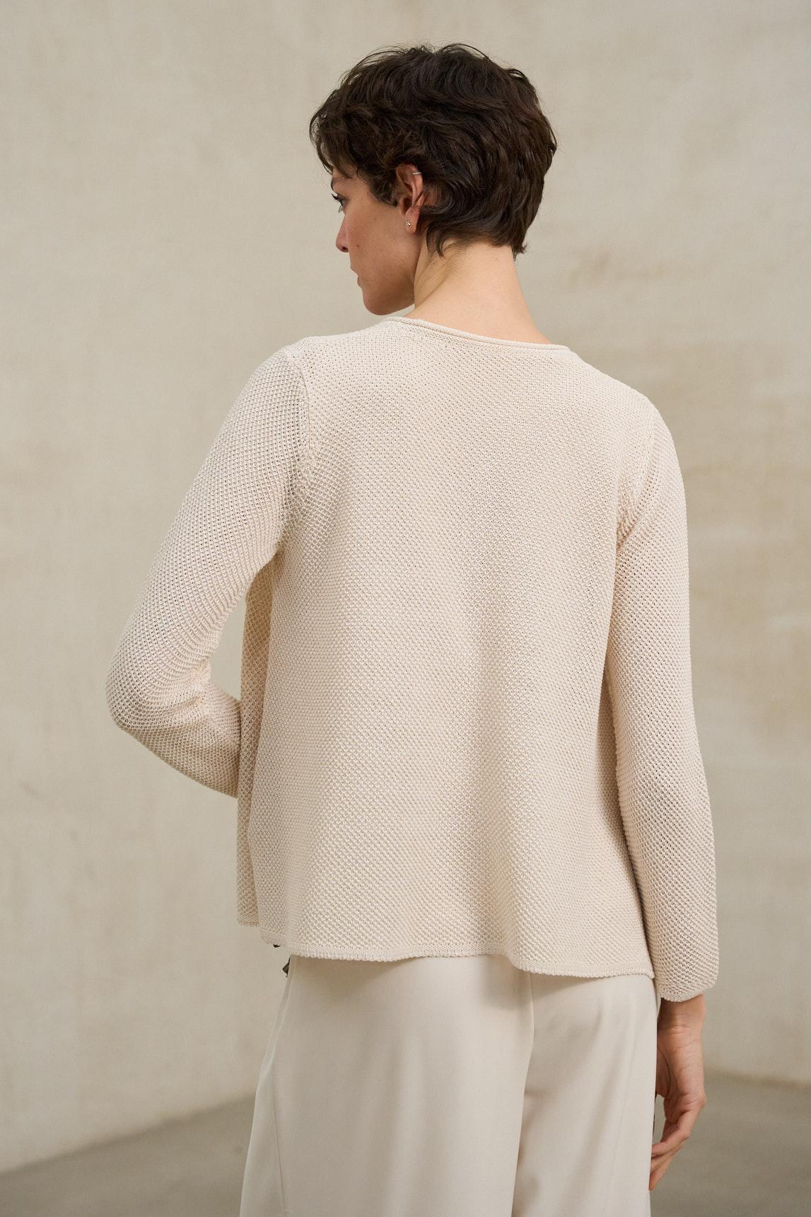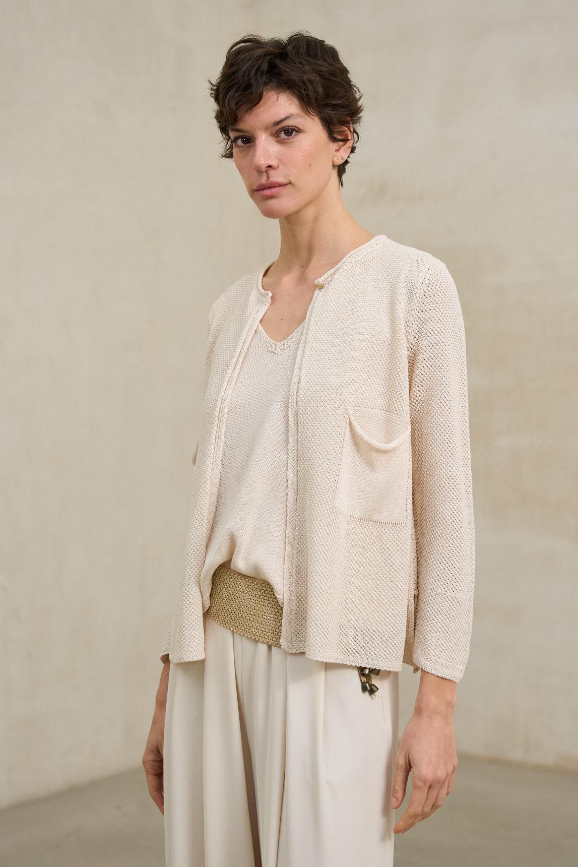 The Lierne ecru cardigan is a women's garment made from a lightweight knit fabric with a soft feel and flowing drape. It features a rounded neckline without a lapel, a front button closure in matching colors, and long sleeves. Its design incorporates a subtle play of volume at the hem, creating a relaxed and contemporary silhouette that adds movement to the overall look. The Lierne ecru knit jacket stands out for its minimalist and versatile aesthetic. Its luminous neutral tone makes it easy to combine with flowing trousers, coordinated sets, or soft-wash denim. It can be worn as a light jacket for in-between seasons or as a structured knit overshirt for more relaxed looks. Designed for a nature-inspired wardrobe, it is a balanced knitwear piece that brings elegance without rigidity. We strive to display colors as accurately as possible, but they may vary slightly from reality.