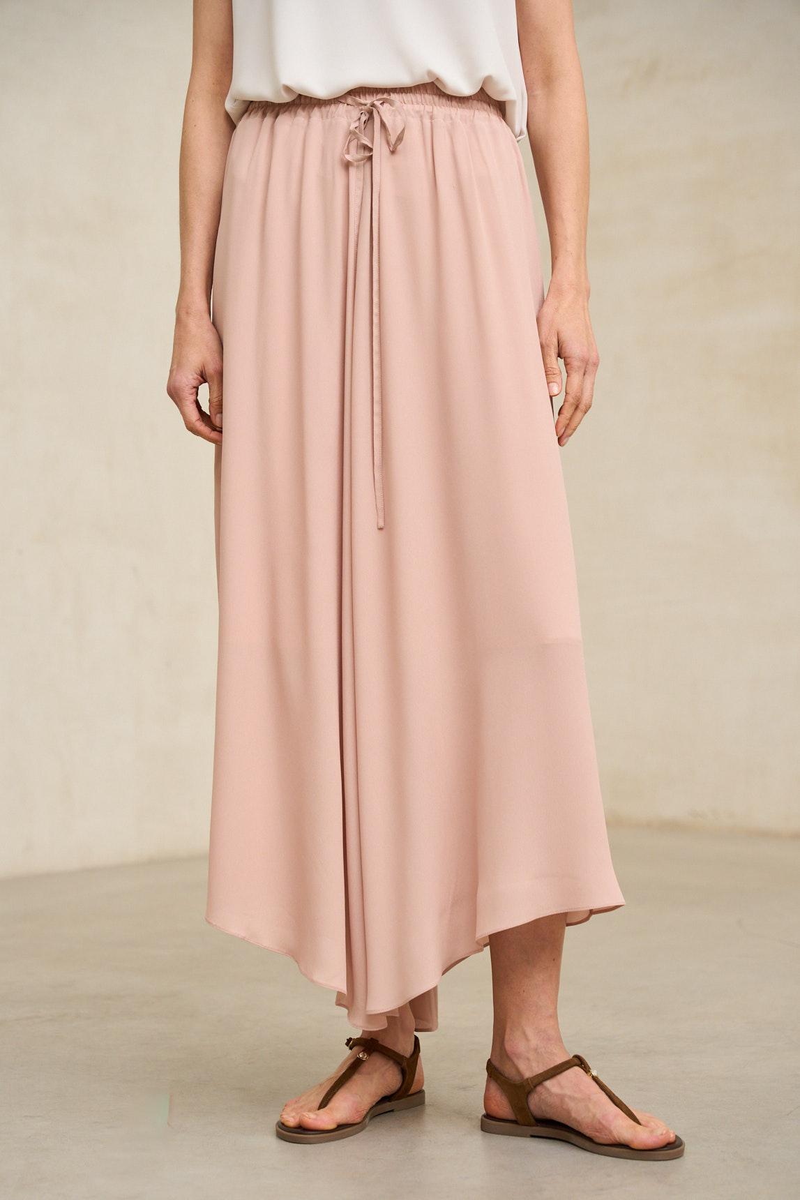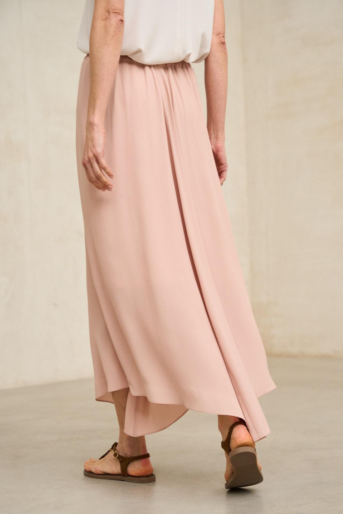 This midi skirt is crafted from a lightweight fabric with a soft drape and flowing movement. Its asymmetrical design with an irregular hem adds dynamism without sacrificing elegance. The smooth, powdery pink hue subtly and subtly enhances the silhouette with sophistication.