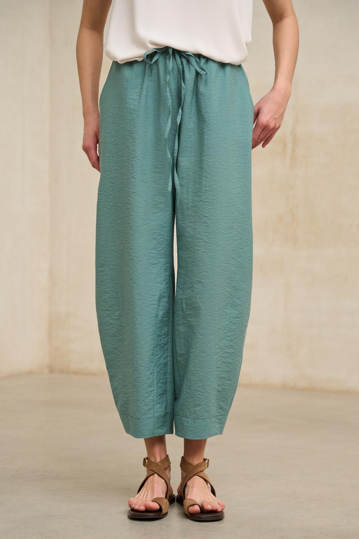 Pantalón de mujer confeccionado en tejido ligero con textura natural y caída suave. Presenta cintura elástica con fruncido delicado y pernera amplia ligeramente ajustada en el bajo, creando una silueta relajada con volumen controlado. Incorpora bolsillos laterales discretos que aportan funcionalidad sin alterar la línea limpia del diseño.