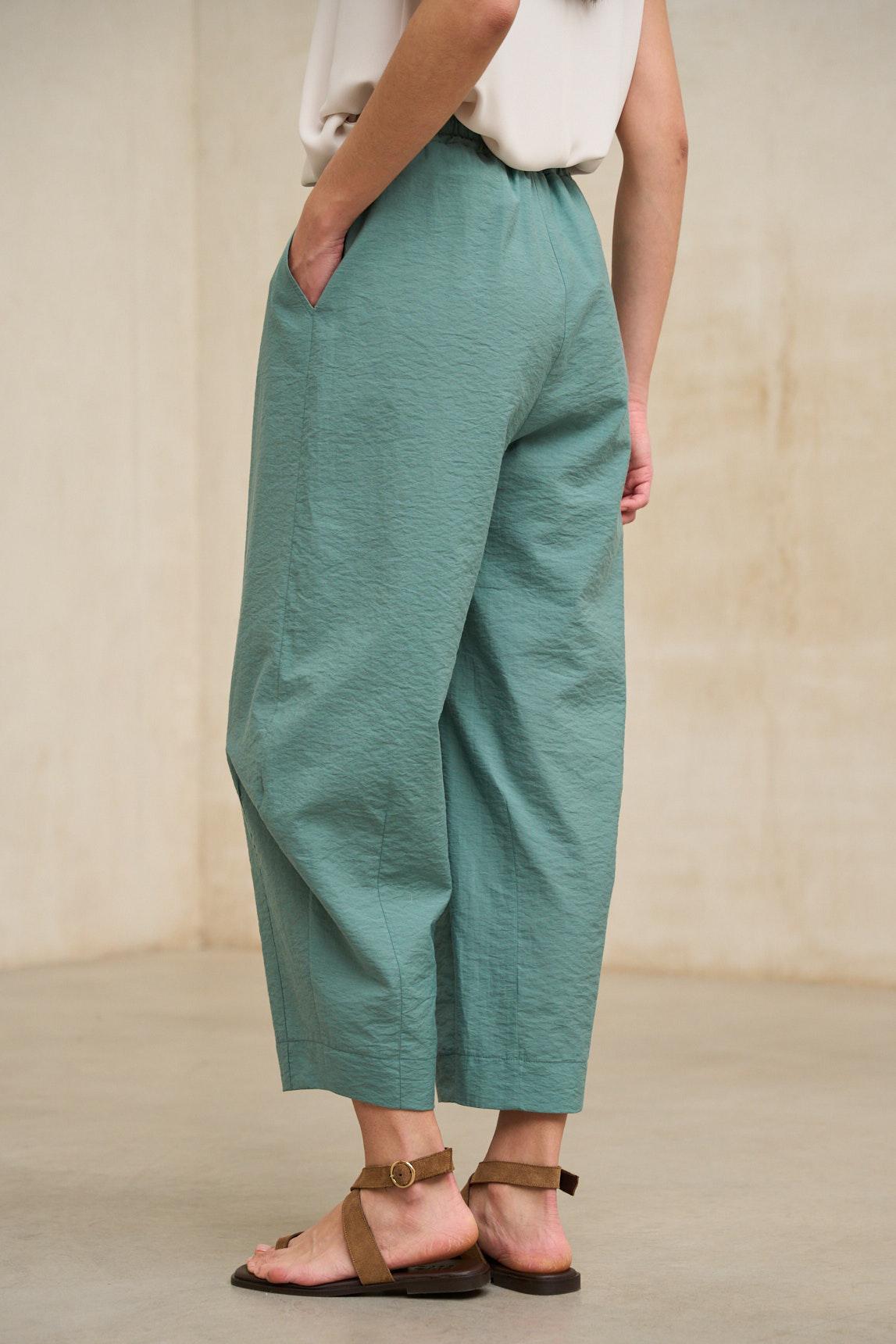 El Pantalón Éldan verde turquesa transmite frescura y serenidad. Su tono suave y natural combina fácilmente con blancos rotos, crudos o tonos arena, siendo ideal para estilismos de primavera con un aire relajado pero cuidado. La forma abombada aporta carácter contemporáneo sin perder comodidad.