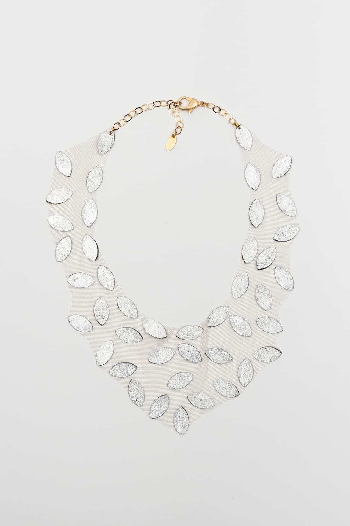 Bib-style necklace made on a semi-sheer ivory tulle base, light and flexible. It is decorated with multiple almond-shaped metallic leaf appliques in a textured gold finish, distributed throughout the piece to create a mosaic effect. Its reversible design allows it to be worn with a gold finish on one side and a silver finish on the other, easily adapting to different looks and styles. Top closure with an extendable chain and lobster clasp to adjust to the neck.