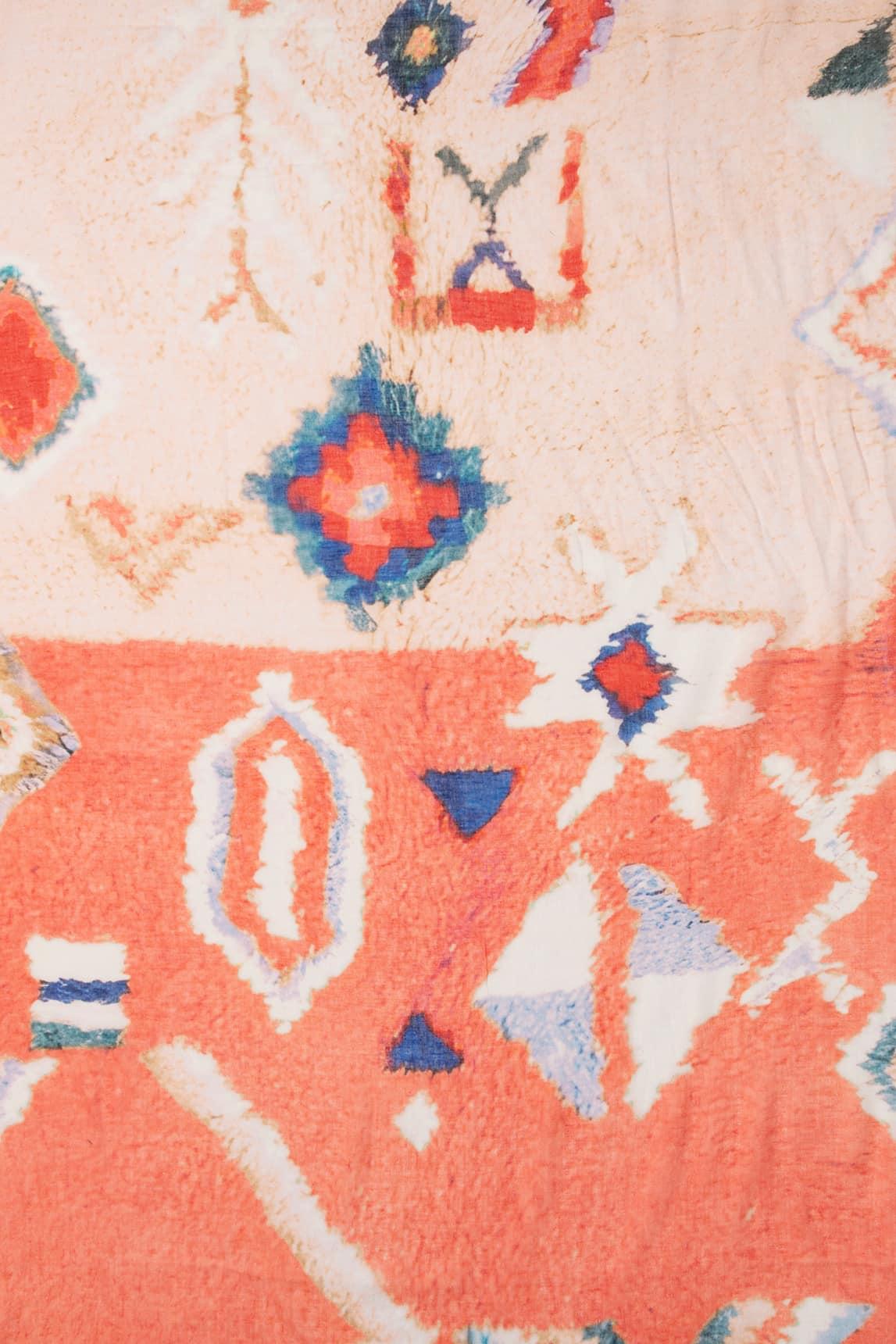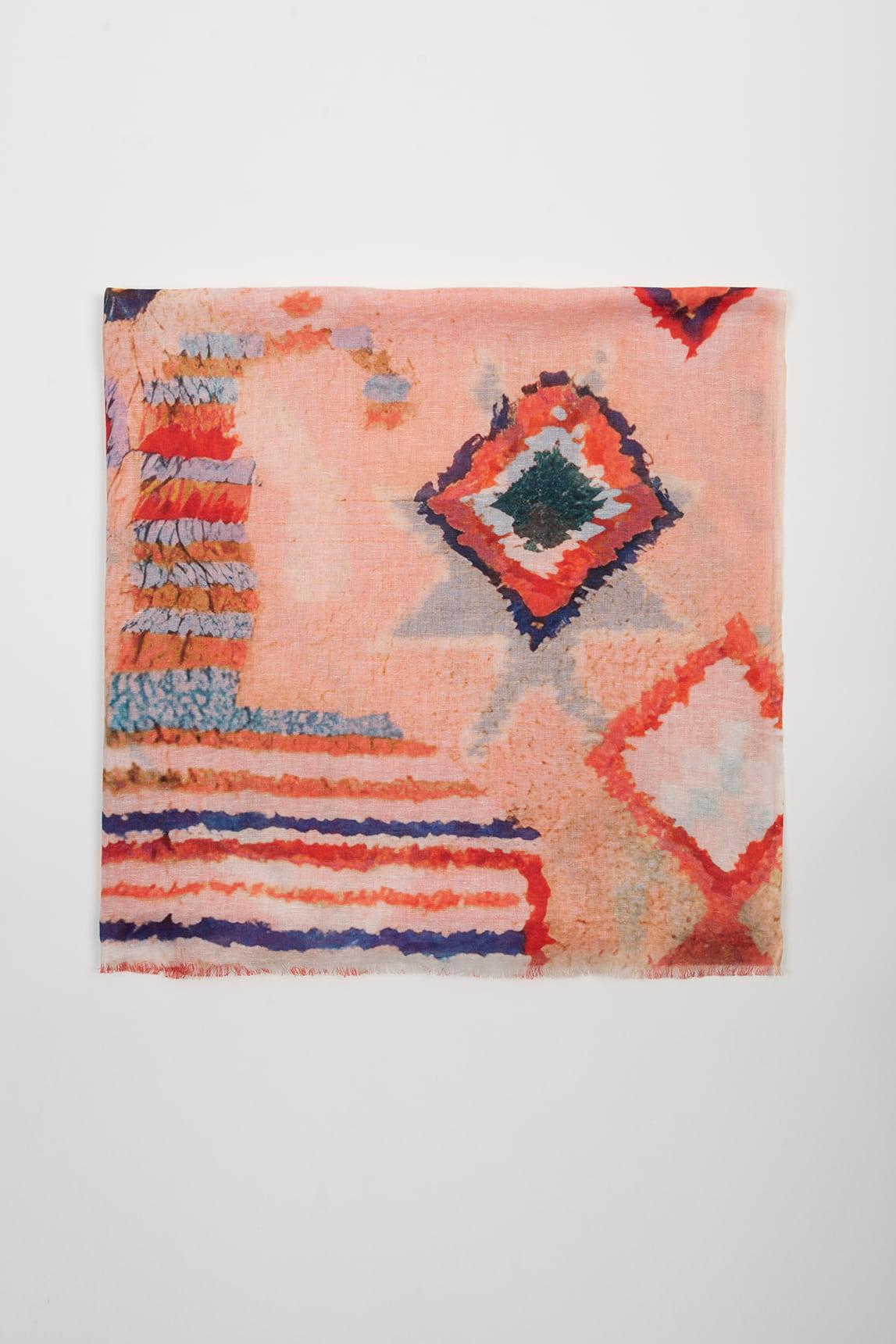Women's scarf made from a natural blend of 60% cotton, 20% modal, and 20% linen. Its lightweight and soft fabric features an abstract print in coral, blue, and sand tones that combines energy and color harmony. The frayed edges add a handcrafted and casual finish.