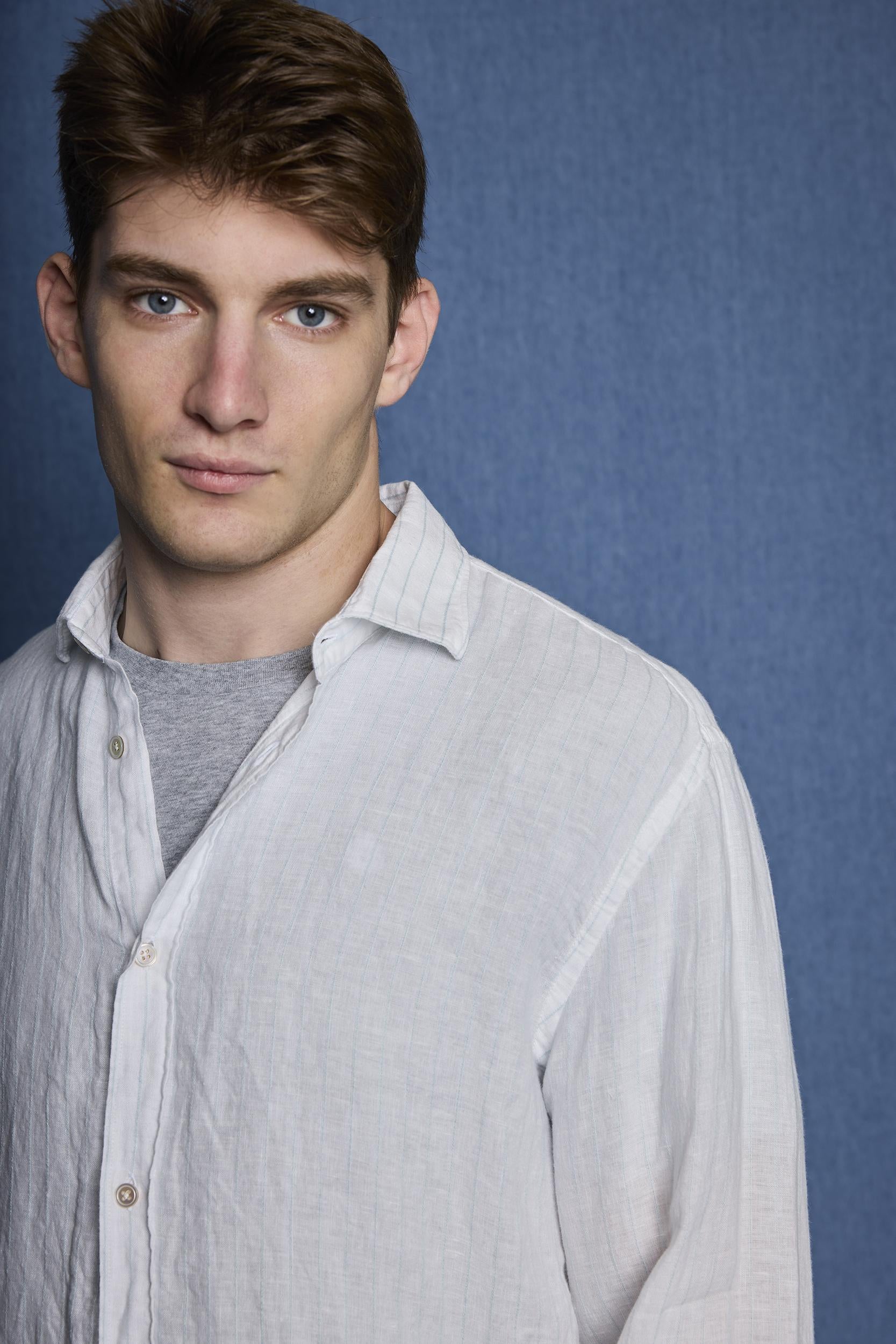 Men's white shirt with a soft blue vertical stripe, straight silhouette, and classic collar. The design features a front button closure, long sleeves, and buttoned cuffs, maintaining a clean, bright, and balanced look. The fine stripe adds visual dynamism and reinforces a timeless aesthetic, very easy to integrate into refined outfits.