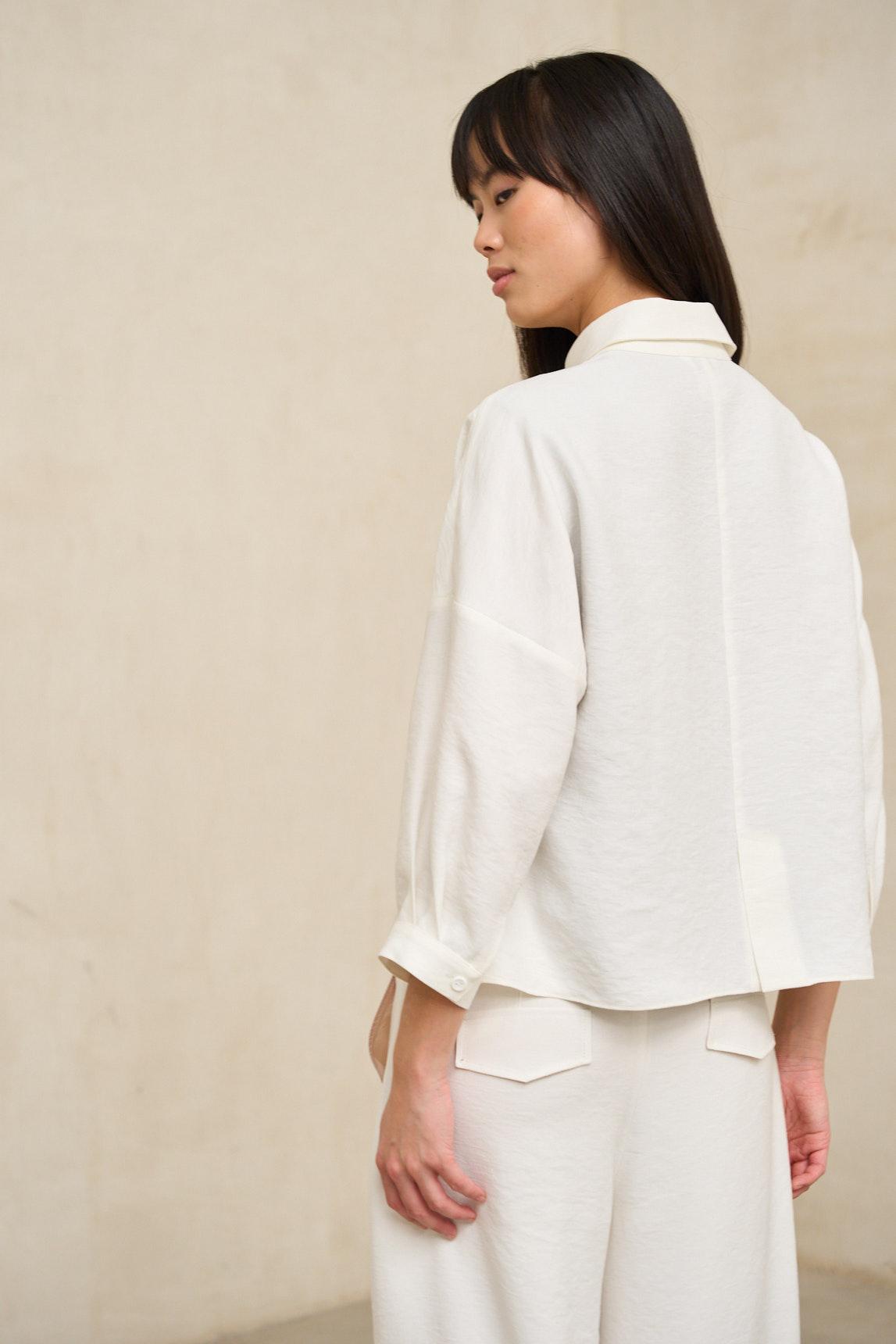 Women's jacket made of lightweight fabric with a natural crinkled texture. It features a classic collar, tone-on-tone button front closure, and front patch pockets that balance the design. Long sleeves with a soft drape and a straight hem, with a fluid structure that follows movement and offers a slightly irregular finish.