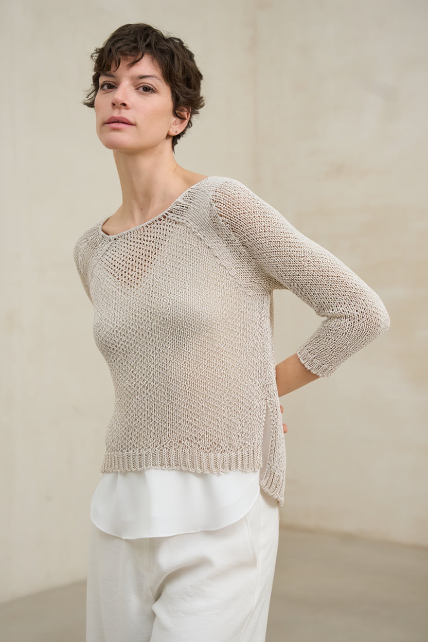 The Évela stone sweater combines the lightness of fine knit with delicate openwork on the upper part, adding texture and visual depth. Its fabric is subtly translucent, creating a light and ethereal effect; it is recommended to wear it with an inner top (not included), such as the Alenia off-white top for a natural and balanced finish.