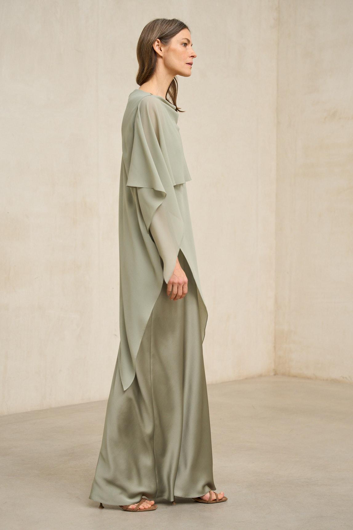 The Kaedryn sage green dress redefines the concept of a guest dress with a fluid and refined aesthetic. Its straight, flowing cut allows for the natural movement of the fabric, creating an elegant silhouette without rigidity. The integrated, lightweight, and enveloping cape can be adjusted and worn as a scarf or draped softly over the shoulders, creating a sophisticated and flattering effect. This detail makes the design a versatile piece that allows for different finishes to suit any desired style. The sage green hue brings serenity and modernity, making it a perfect choice for daytime weddings, communions, or special events where understated elegance is desired. A balanced option that combines minimalism with presence. We strive to display colors as accurately as possible, but they may vary slightly from reality.
