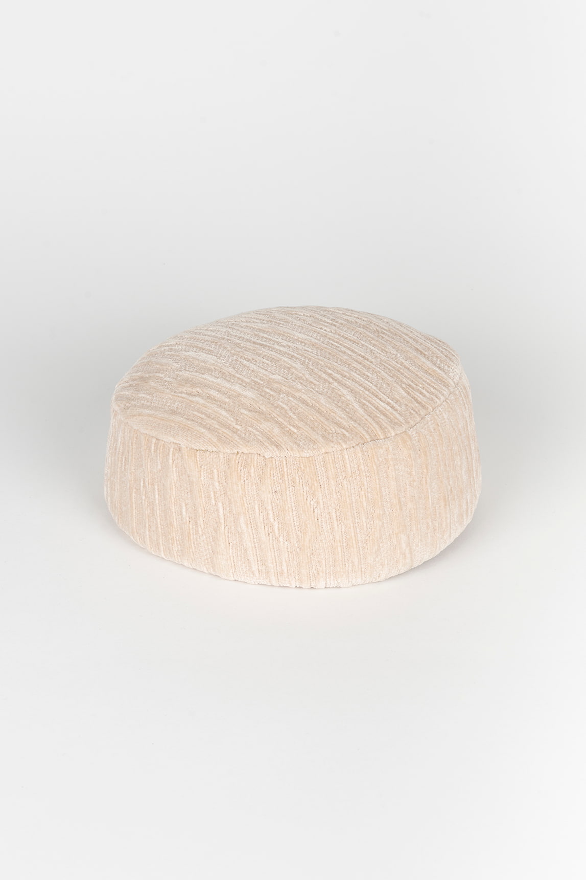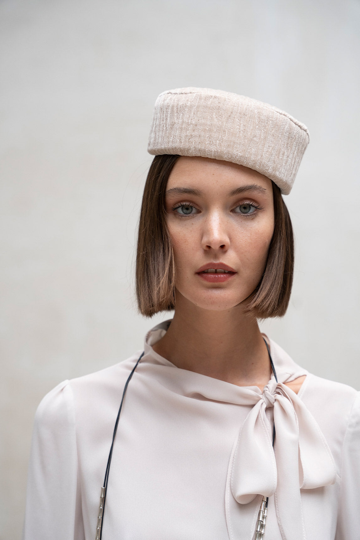 - Sombrero tipo casquete de inspiración retro, con silueta redondeada y acabado texturizado en color arena.
