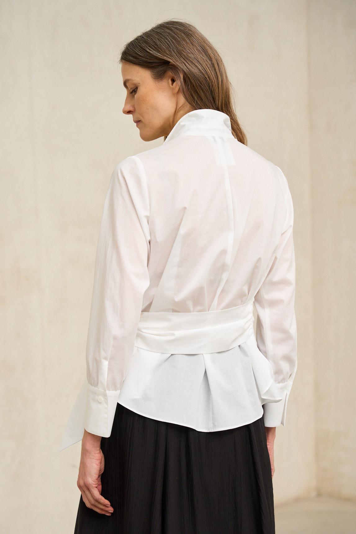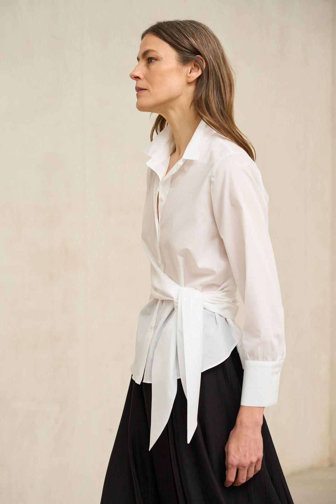 El cruce frontal estiliza visualmente el torso y permite ajustar ligeramente la prenda mediante la lazada, creando una silueta femenina sin resultar ceñida. Su bajo ligeramente asimétrico aporta dinamismo y facilita llevarla tanto con pantalones rectos como con siluetas más amplias.