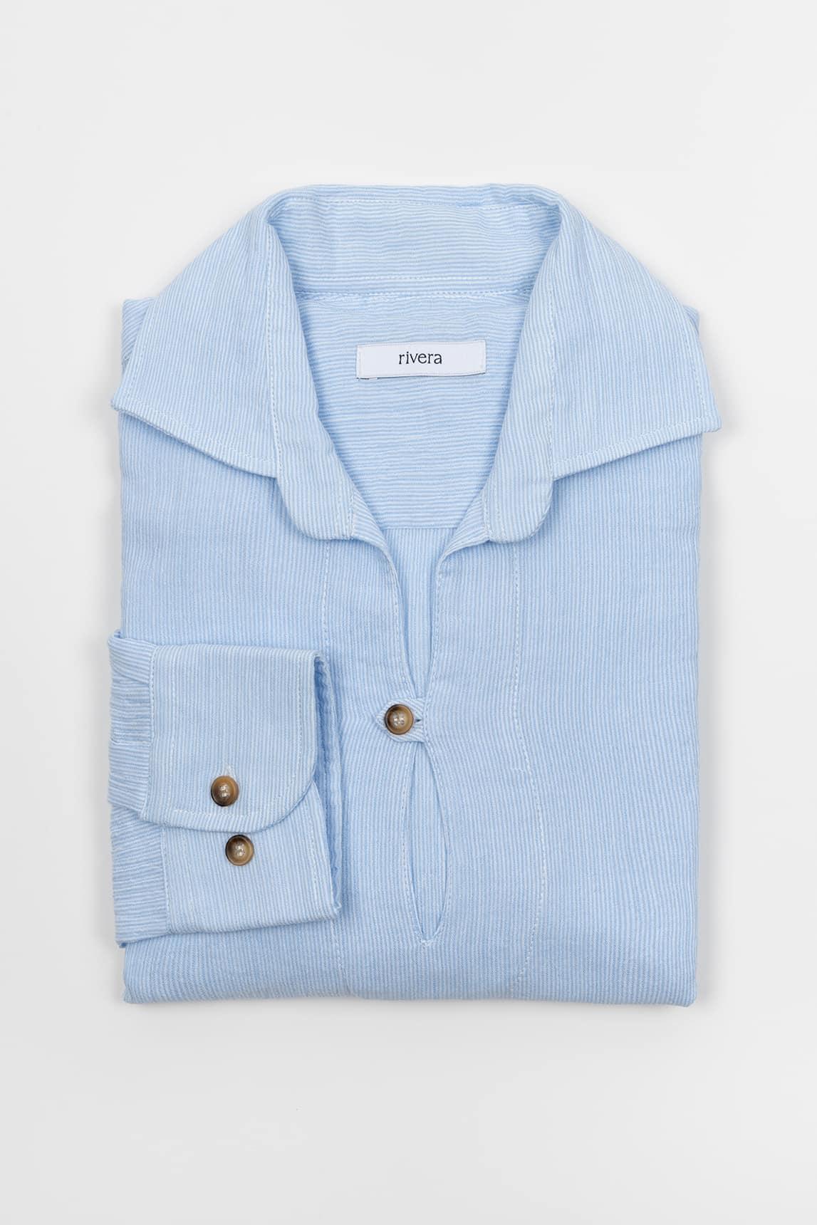Camisa de hombre de manga larga en tono celeste, con una silueta recta y diseño limpio de inspiración relajada. El modelo incorpora cuello abierto, abertura frontal corta con botones y puños con botón, construyendo una imagen equilibrada entre comodidad y estilo. El acabado visual ligero y la textura sutil del tejido refuerzan su aspecto natural, aportando profundidad sin recargar la prenda y favoreciendo una caída fluida.
