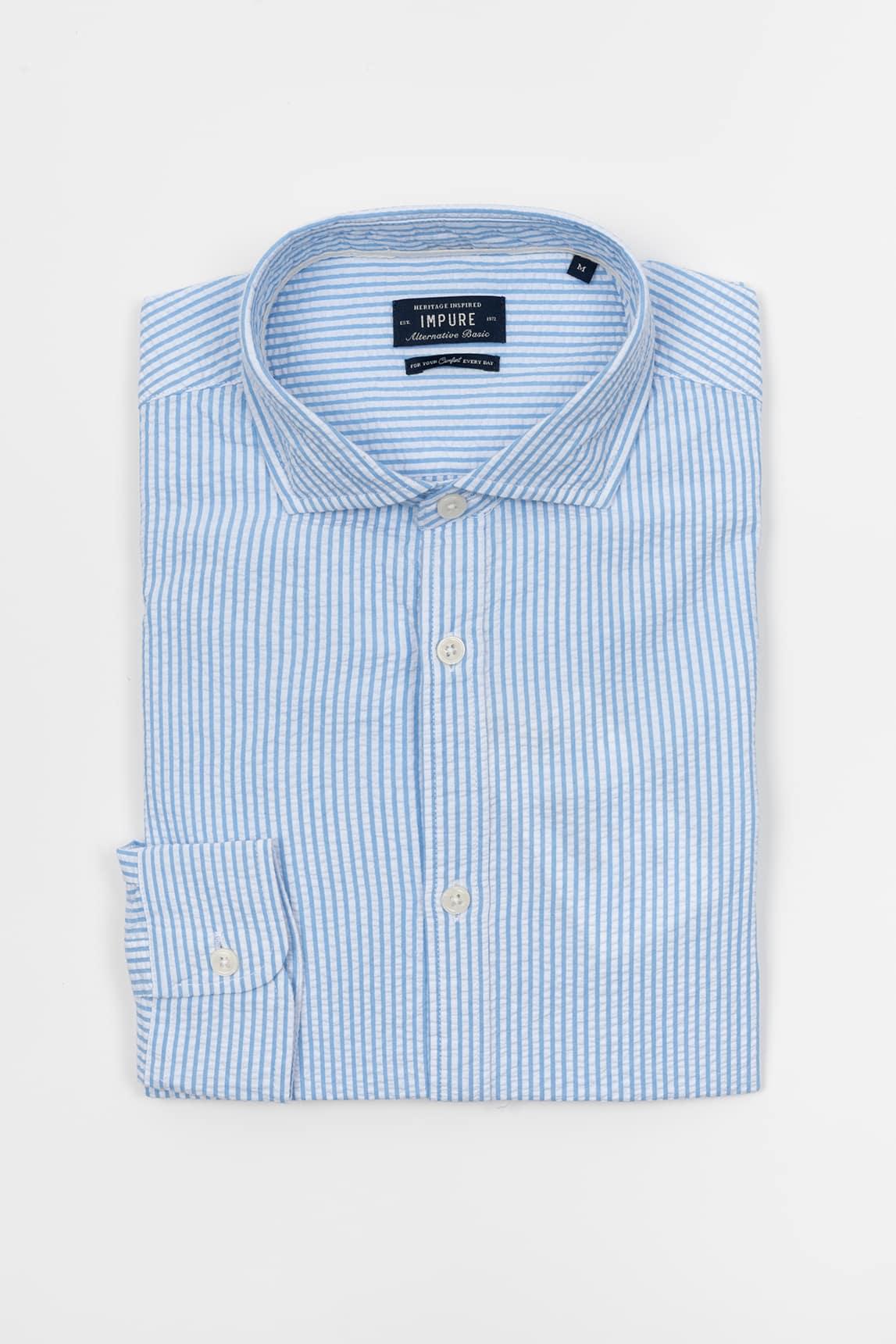 Camisa de manga larga en azul cielo con raya vertical fina y una construcción ligera de aspecto fresco. El diseño incorpora cuello clásico, botonadura frontal vista y puño abotonado, manteniendo una imagen limpia y equilibrada. La superficie presenta una textura visual suave que acompaña el dibujo lineal del tejido aparente, mientras la caída recta y fluida refuerza una sensación cómoda y natural en el conjunto.