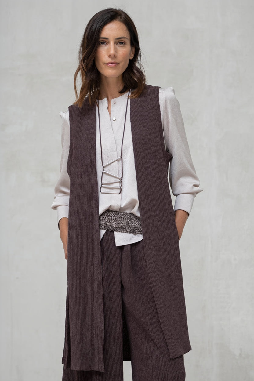 - Tejido ligero con textura acanalada y caída fluida que aporta movimiento.