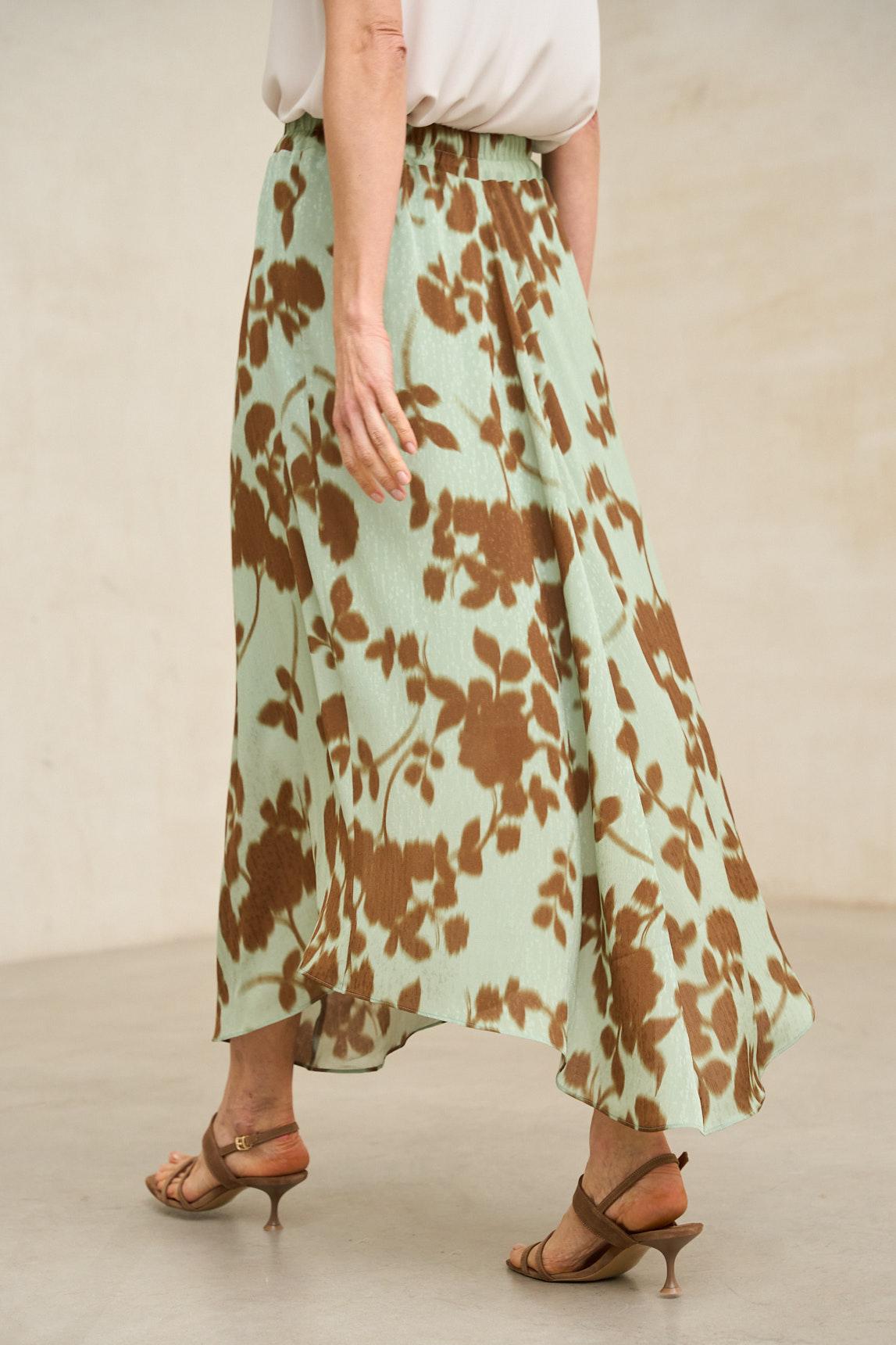 Falda midi confeccionada en tejido ligero con movimiento fluido y caída natural. Presenta diseño asimétrico con picos irregulares que aportan dinamismo y ligereza visual. El estampado en tonos verdes y matices neutros crea un contraste equilibrado y fresco.
