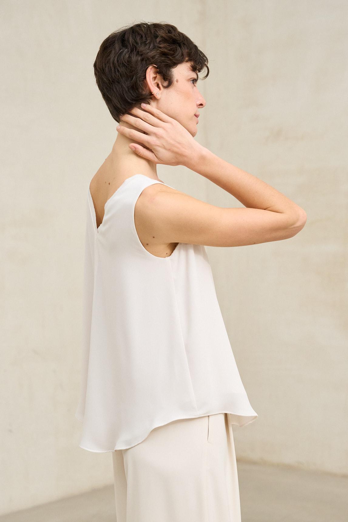 Este top sin mangas presenta una silueta amplia y ligera, definida por un escote en pico tanto en el delantero como en la espalda, que estiliza la parte superior y aporta una línea limpia y equilibrada. El tejido ofrece una caída fluida y continua, con un acabado liso que potencia la sensación de suavidad y movimiento. El bajo ligeramente redondeado refuerza su carácter relajado, mientras que el corte suelto permite que la prenda acompañe el cuerpo sin ajustarse.