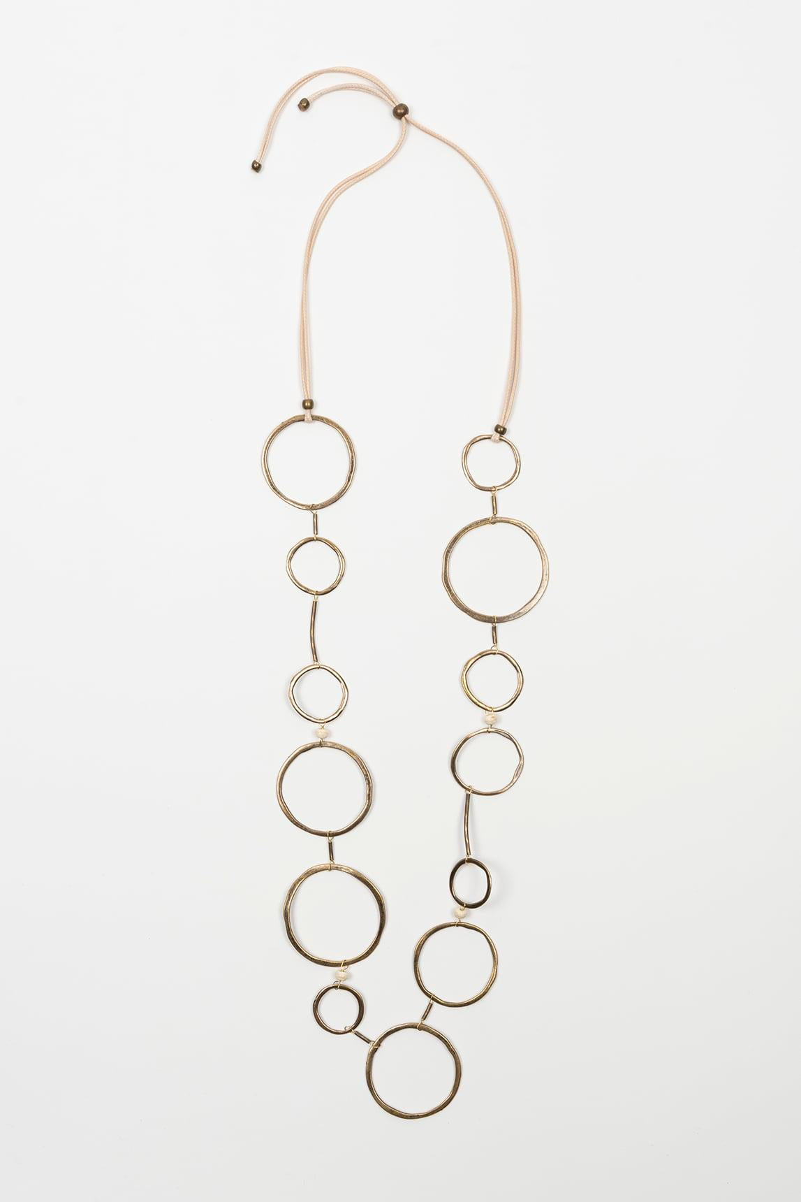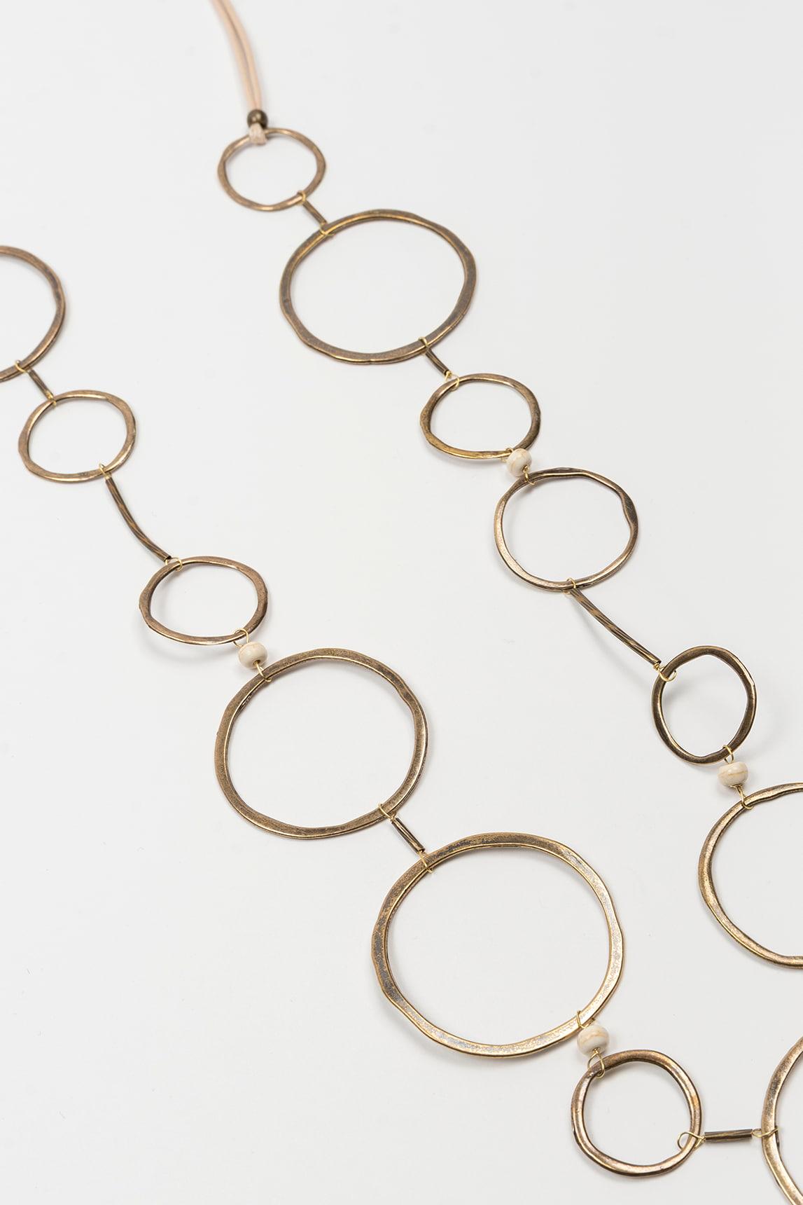 El collar Ciranel destaca por su diseño largo y geométrico compuesto por una sucesión de aros metálicos de distintos tamaños que crean un ritmo visual dinámico y elegante. Su estructura ligera genera movimiento natural al caminar, aportando sofisticación sin rigidez. La combinación de círculos interconectados aporta equilibrio entre minimalismo y carácter, convirtiéndolo en una pieza protagonista pero versátil. Su silueta vertical estiliza visualmente el torso y lo hace ideal para llevar sobre vestidos lisos, blusas fluidas o conjuntos monocromáticos. El acabado metálico cálido refuerza su estética contemporánea y combina especialmente bien con tonos crudo, arena, camel o negro, aportando luz y estructura al conjunto. Una pieza moderna y atemporal pensada para elevar estilismos sencillos con un toque arquitectónico y femenino. Nos esforzamos por mostrar los colores de la forma más fiel posible, pero pueden variar ligeramente respecto a la realidad.