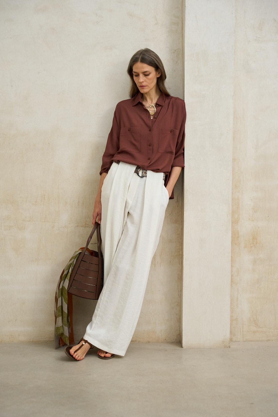 Camisa de mujer confeccionada en tejido satinado ligero con un brillo sutil que realza su tono marrón. Presenta cuello clásico, cierre frontal con botones al tono y dos bolsillos de plastrón con solapa que aportan equilibrio al diseño. Manga larga con puño sencillo y bajo recto que permite llevarla tanto por dentro como por fuera de la prenda inferior. Su corte fluido y la textura satinada aportan un aire sofisticado y atemporal.