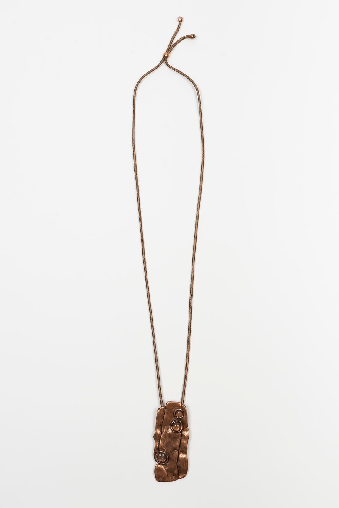 El collar Tavira en cobre presenta la misma estructura larga y limpia con colgante central de textura marcada que aporta dinamismo y personalidad.