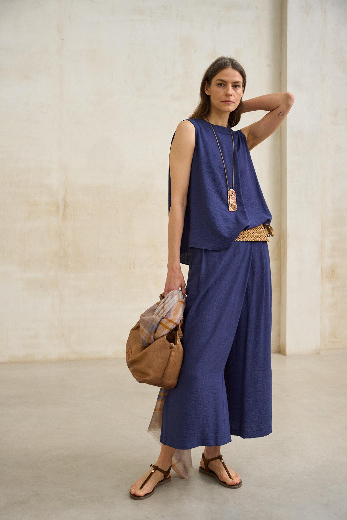 El top Arvienne azul marino es una prenda sin mangas de líneas limpias y silueta fluida, diseñada para aportar elegancia natural y comodidad en los meses más cálidos. Confeccionado en tejido ligero de caída suave, presenta escote redondo cerrado y hombro ligeramente estructurado que equilibra la figura.