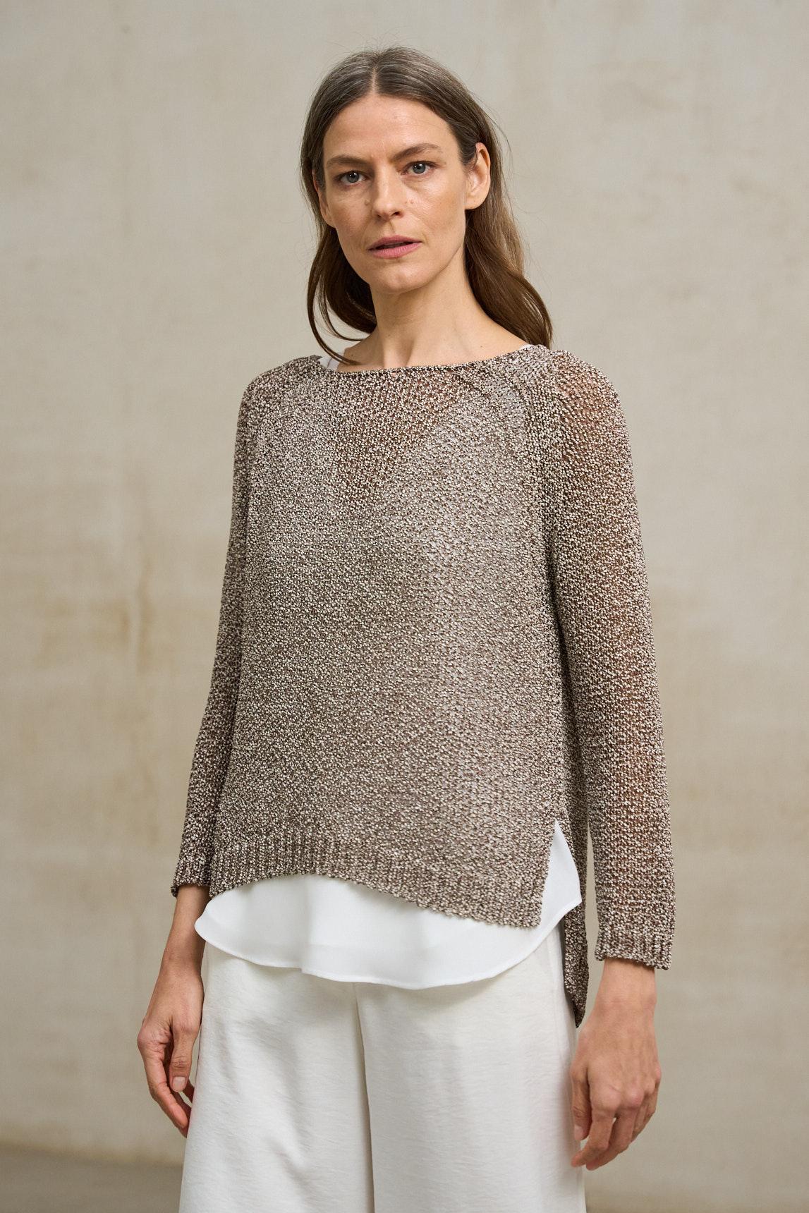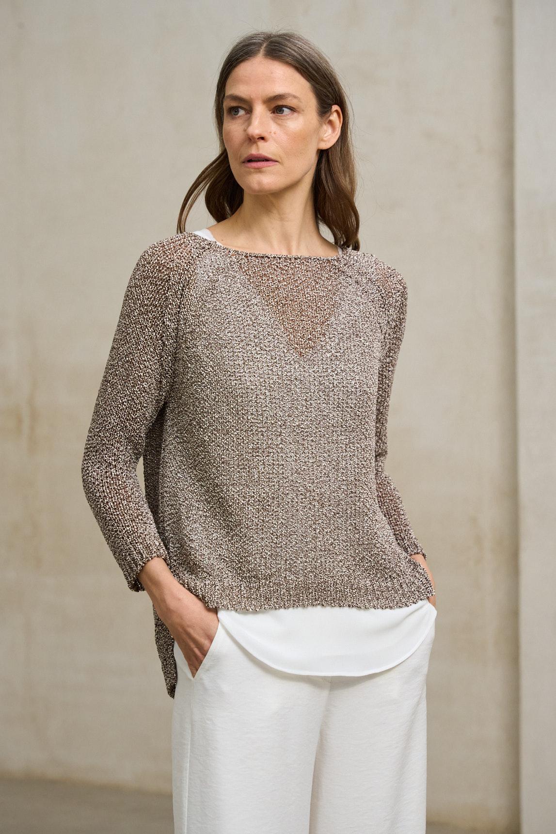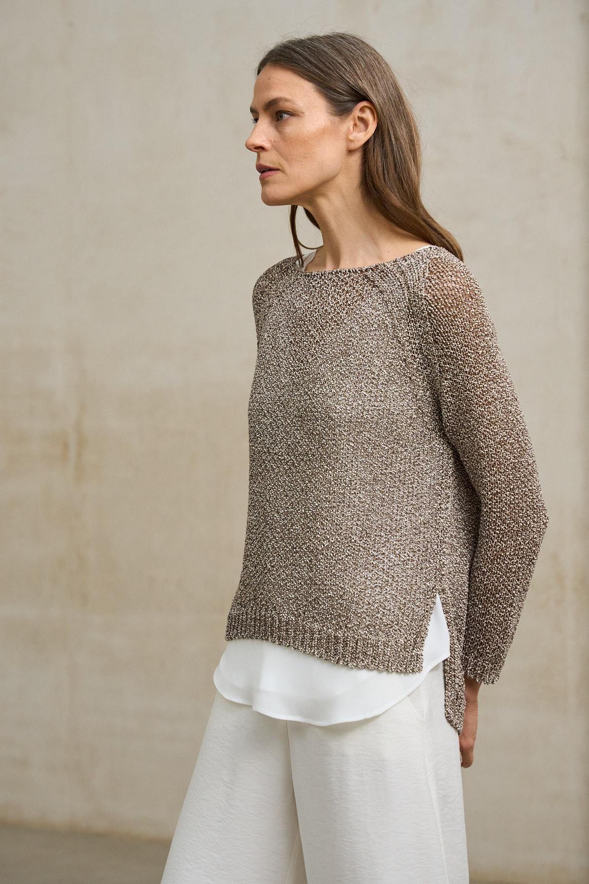El jersey Évela topo claro mantiene su diseño en punto fino con detalle calado en la parte superior, aportando una textura sutil y un acabado visual delicado. El tejido presenta una transparencia ligera y natural, por lo que se recomienda llevarlo con una prenda base (no incluida), como el top Alenia blanco roto para un resultado armónico. Su escote amplio y manga tres cuartos crean una silueta relajada y femenina que se adapta con facilidad a diferentes estilismos. La caída suave del tejido permite combinarlo tanto con pantalones fluidos como con faldas o denim claro. El tono topo claro introduce una alternativa neutra con mayor profundidad que el gris, ideal para estilismos minimalistas o combinaciones con arena, blanco roto o negro suave. Nos esforzamos por mostrar los colores de la forma más fiel posible, pero pueden variar ligeramente respecto a la realidad.