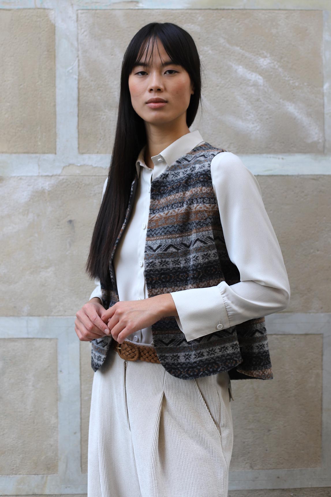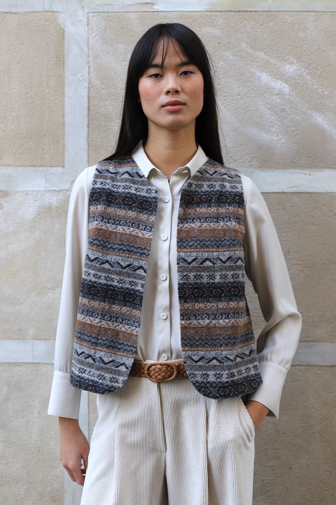 - Chaleco abierto sin cierre, confeccionado en tejido suave en tonos grises con diseño geométrico y étnico característico.