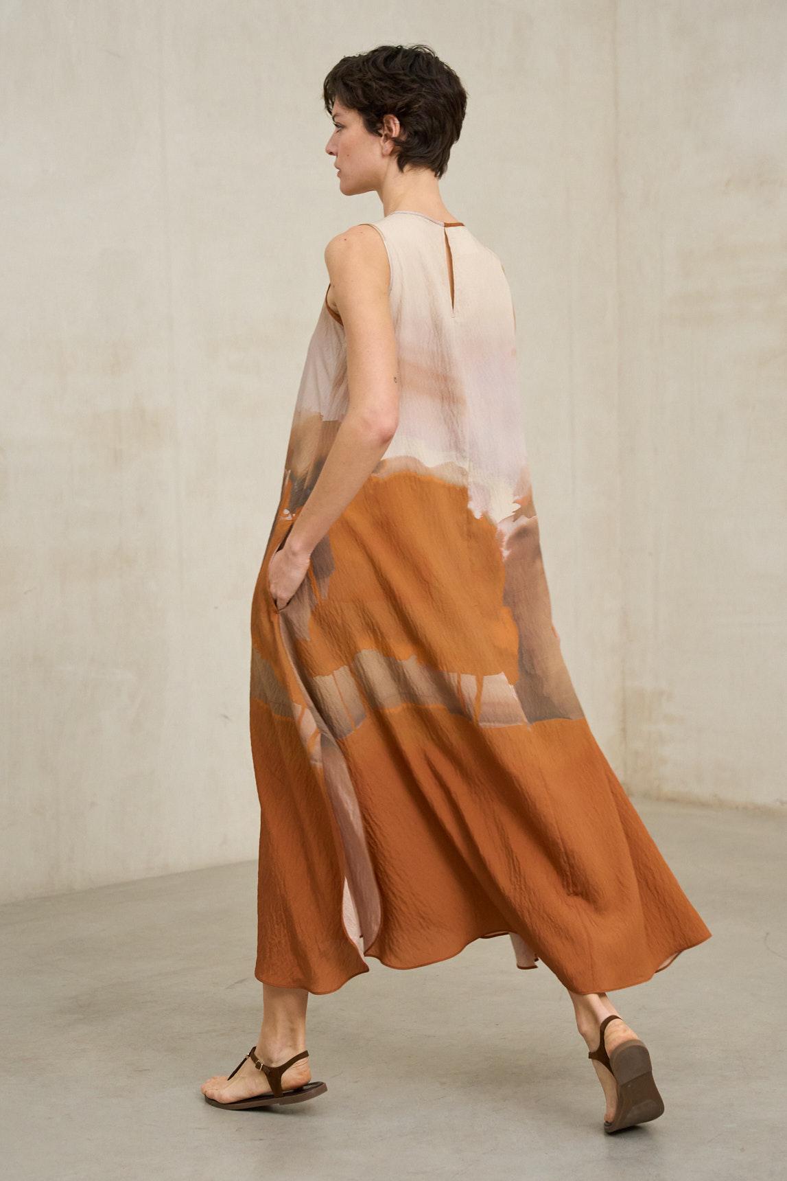 El vestido Lurea degradado terracota es una pieza fluida de inspiración artística que destaca por su efecto acuarela en tonos tierra, arena y blanco suave. Su diseño sin mangas y escote redondeado aporta limpieza visual, mientras que la silueta amplia y evasé genera movimiento y ligereza en cada paso.