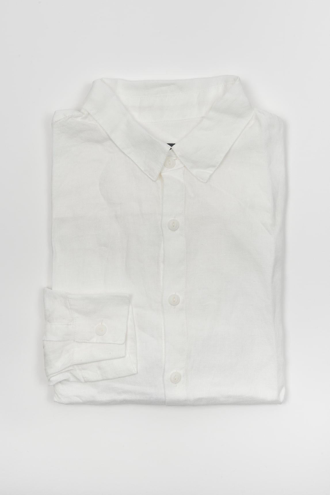 Camisa de hombre de manga larga en tono blanco, con silueta recta y diseño liso de líneas depuradas. Presenta cuello clásico, cierre frontal de botones blancos y puño abotonado, construyendo una imagen limpia, luminosa y muy fácil de llevar. La superficie ofrece una textura visual suave que añade naturalidad al conjunto sin alterar su apariencia sobria, mientras la caída se percibe ligera y ordenada.