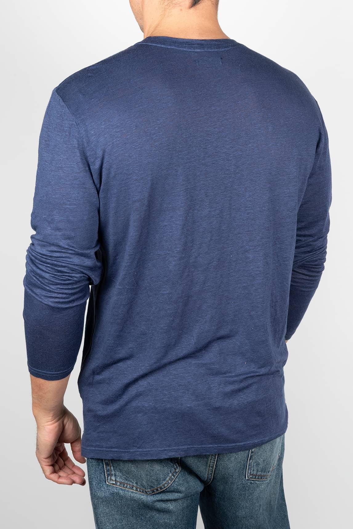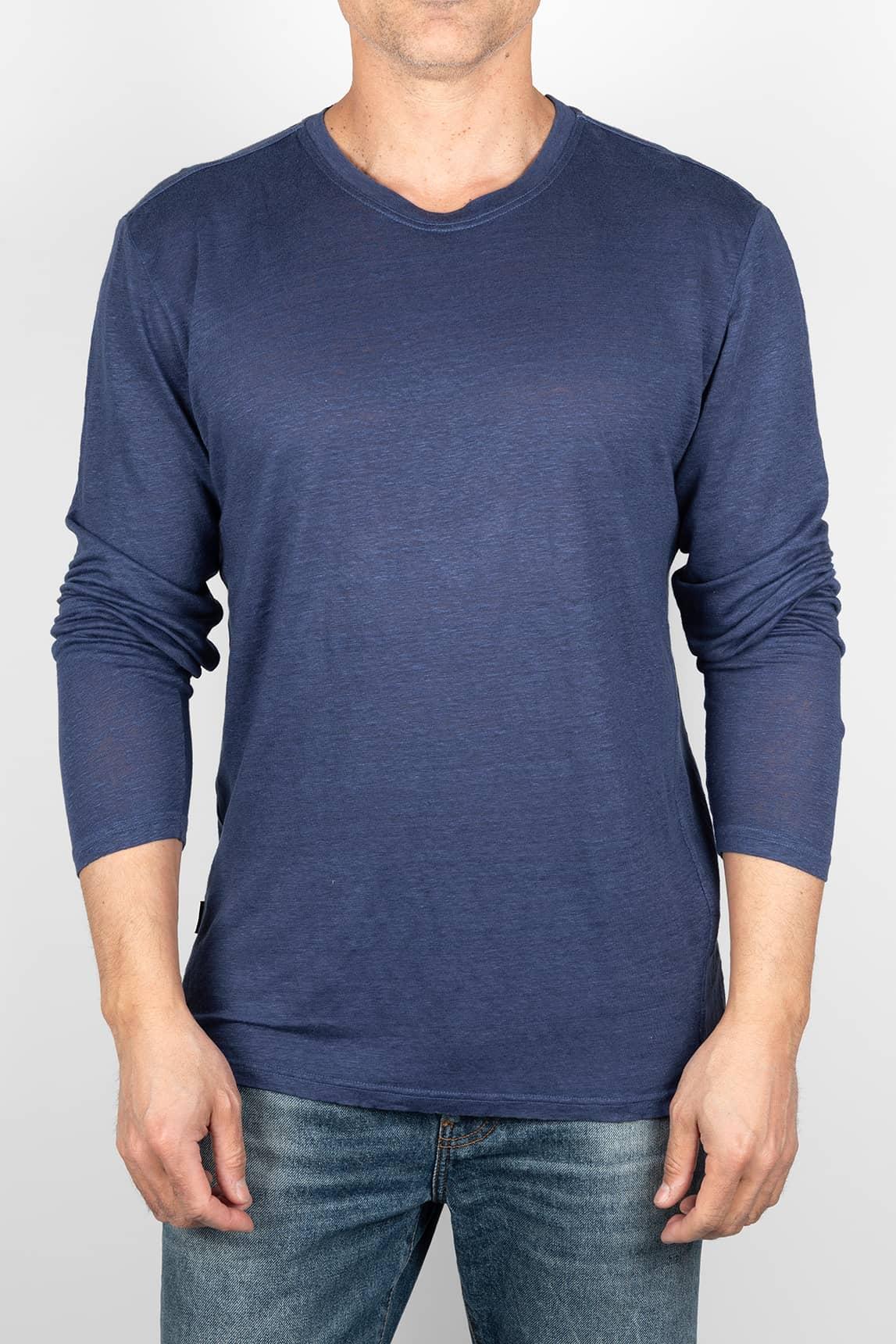 Esta camiseta en tono azul marino de la marca Keeling presenta un diseño esencial y atemporal, con cuello redondo y manga larga que aporta versatilidad en diferentes estaciones. Su tejido de apariencia ligera y ligeramente jaspeada ofrece una textura suave y natural, con una caída fluida que se adapta al cuerpo sin rigidez. Los acabados limpios y el bajo recto refuerzan su estética sencilla y cuidada.