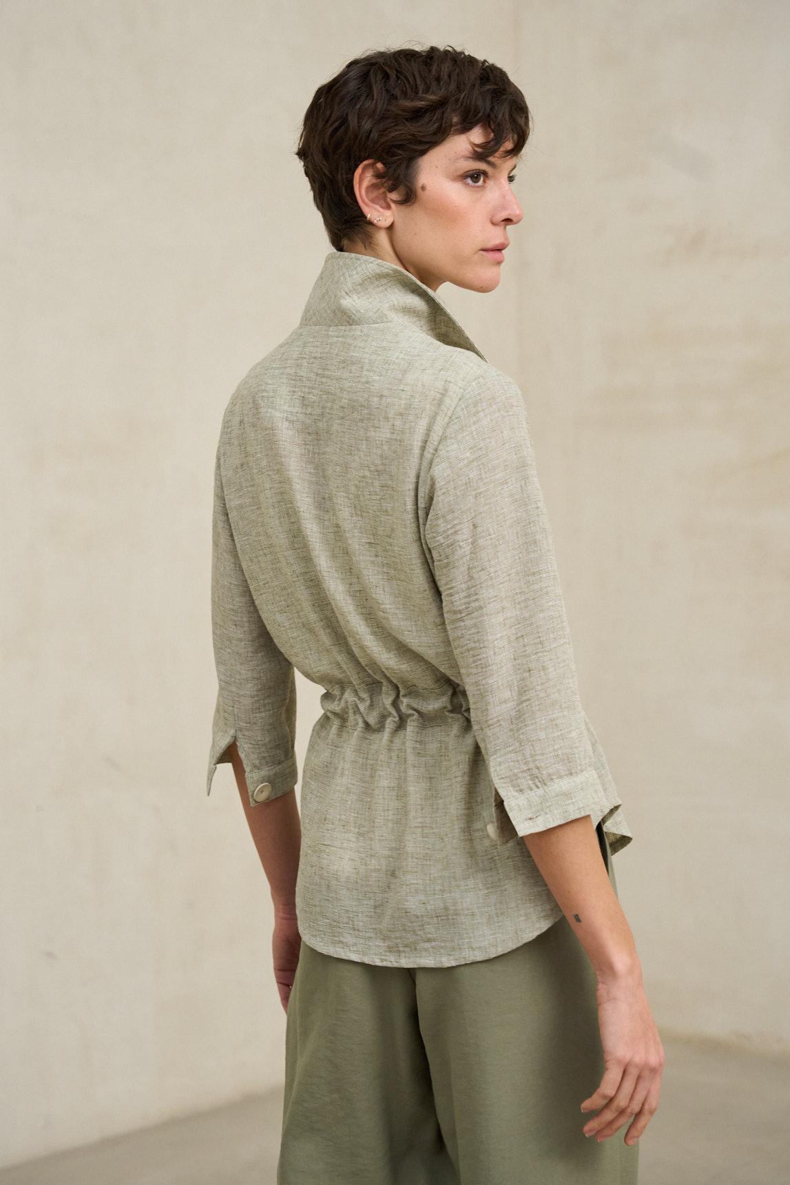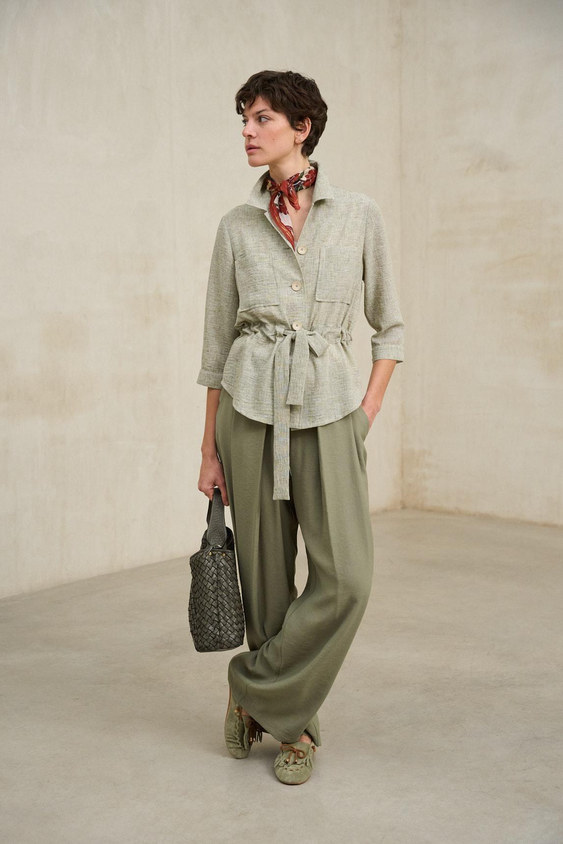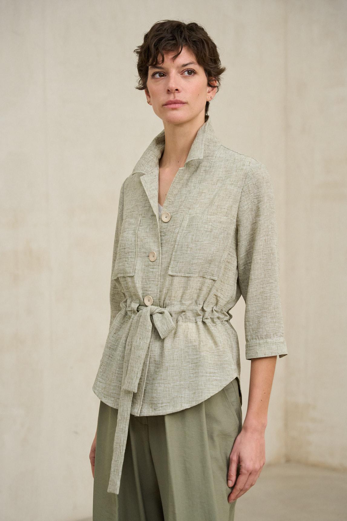 Chaqueta de mujer confeccionada en tejido ligero de tacto natural y acabado suave. Presenta cuello camisero, cierre frontal con botones y bolsillos de plastrón en el pecho que aportan funcionalidad y estructura. Incorpora cinturón del mismo tejido para ajustar la silueta y definir la cintura con un aire relajado y femenino.