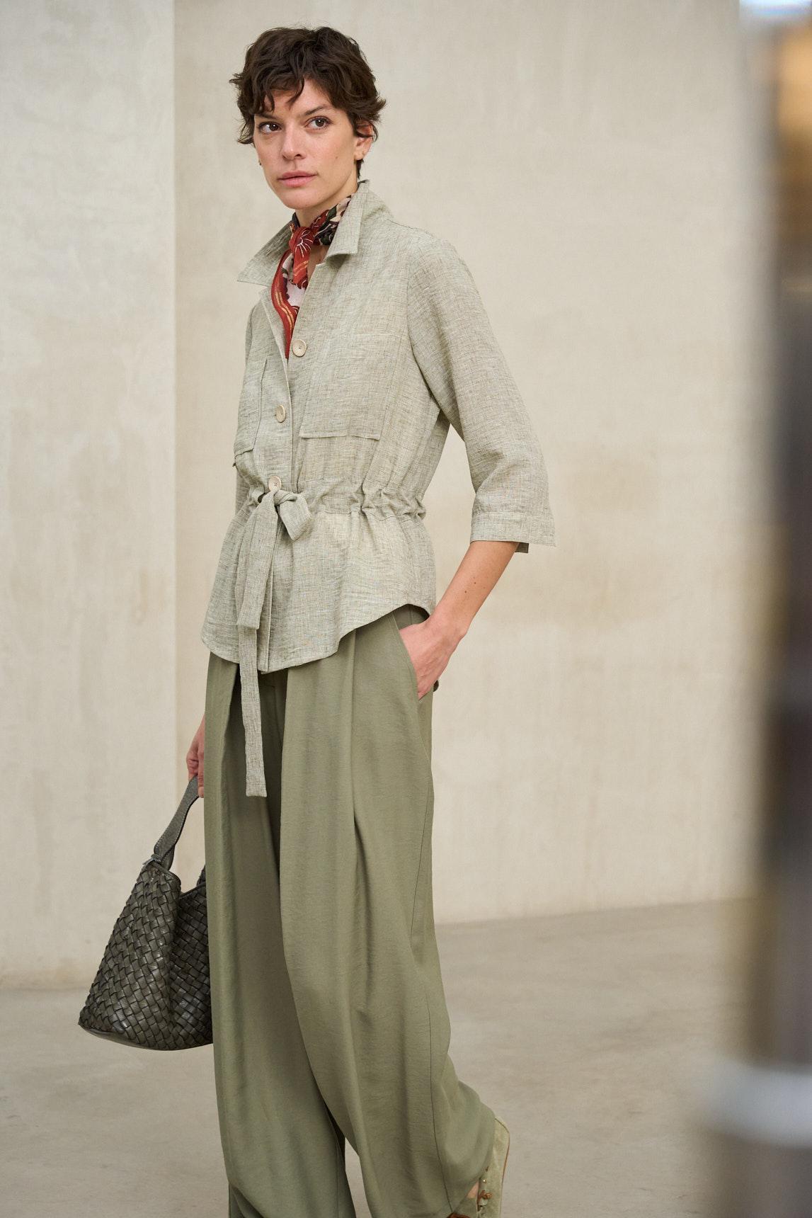 Ideal para entretiempo, funciona como prenda exterior ligera o como pieza protagonista combinada con pantalones fluidos o faldas midi. Una chaqueta versátil que equilibra naturalidad y elegancia relajada.