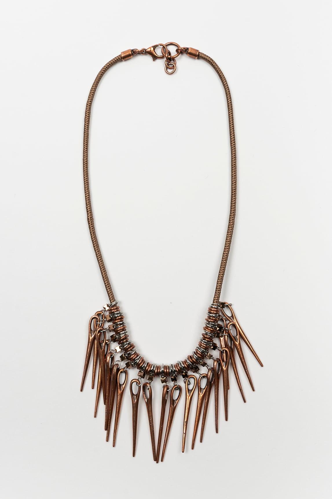 El collar Zerina en acabado cobre mantiene la misma silueta estructurada con base central texturizada y múltiples piezas alargadas en caída dinámica.