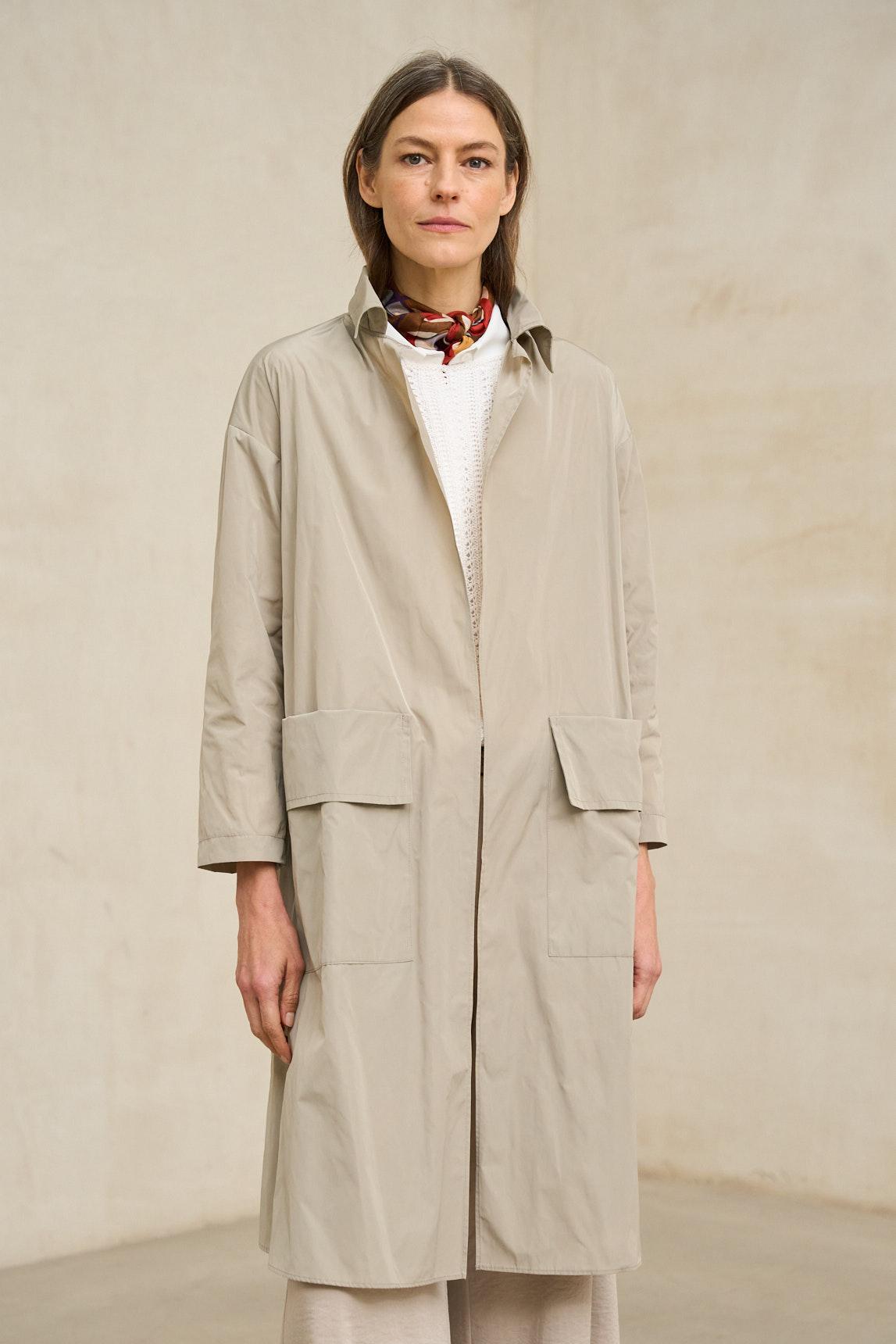 Esta gabardina ligera presenta una silueta recta y depurada, con largo midi que cae por debajo de la rodilla y estructura limpia desde los hombros. El diseño incorpora un cuello amplio y definido, mangas largas y un cierre frontal con cremallera centrada que queda integrada de forma discreta en el conjunto.