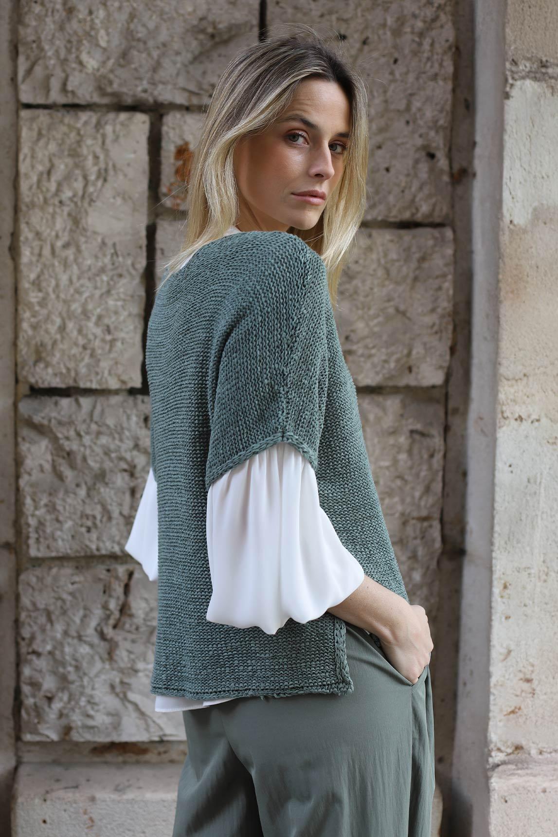 Confeccionado en punto ligero y agradable al tacto, se adapta con facilidad al movimiento y resulta ideal para el uso diario. Su diseño versátil permite llevarlo tanto con pantalones amplios como con faldas o denim, creando estilismos equilibrados y actuales.
