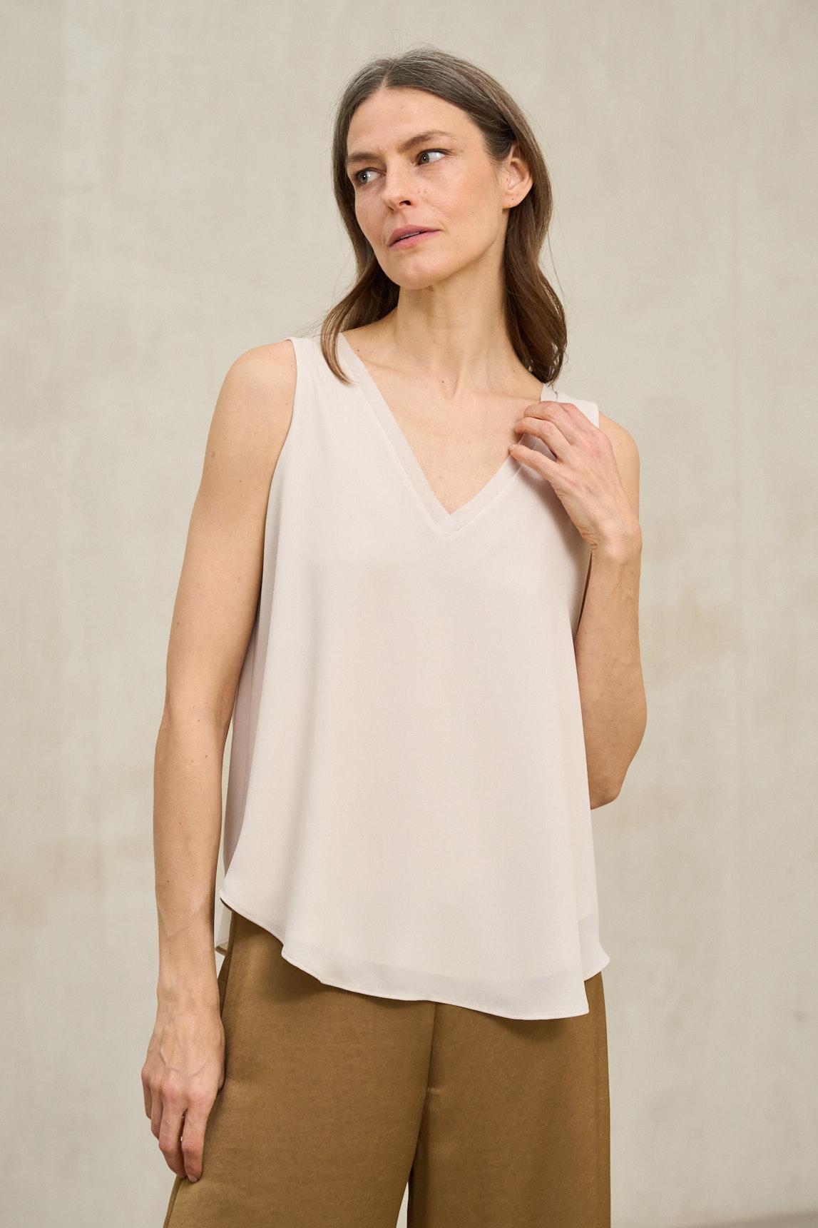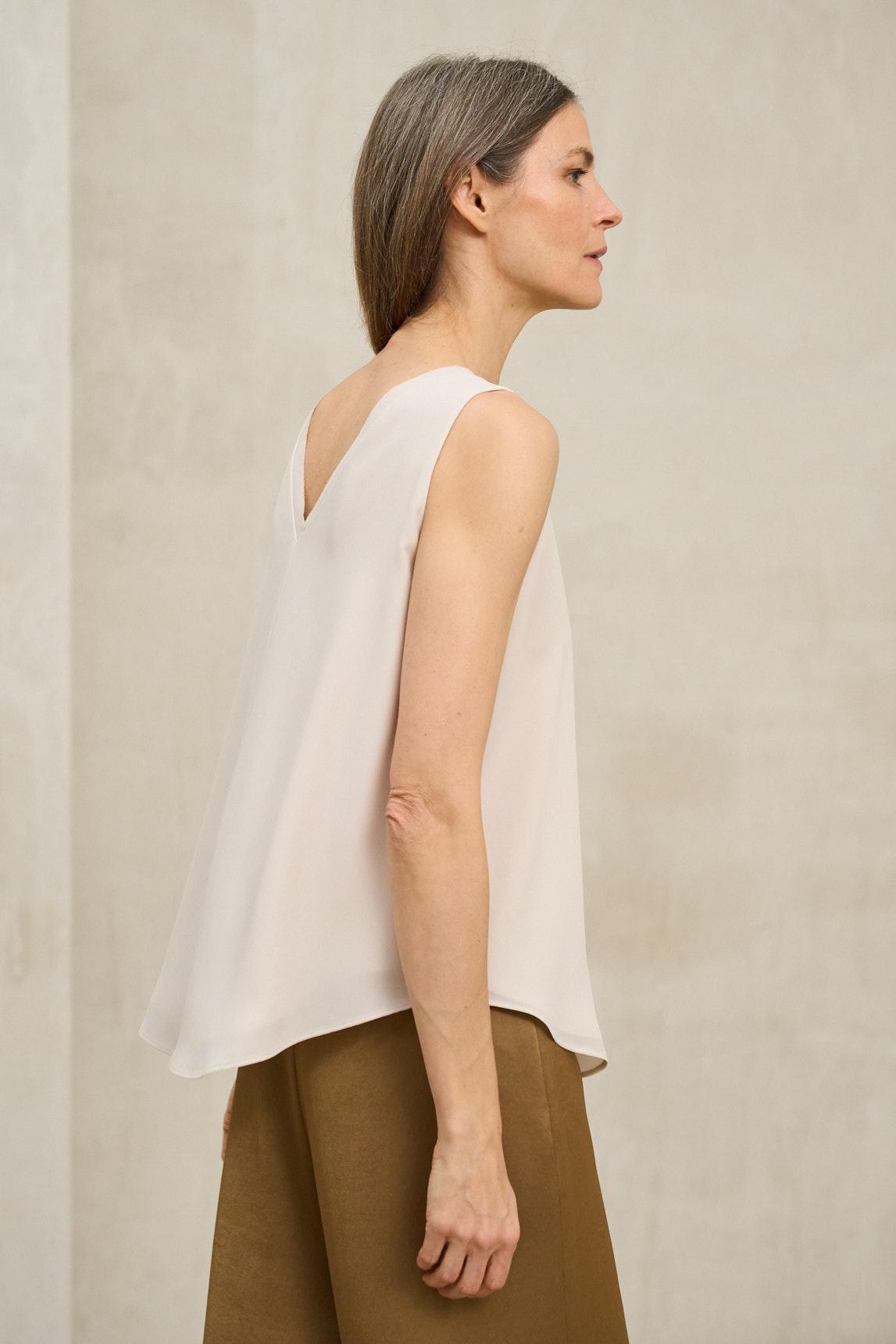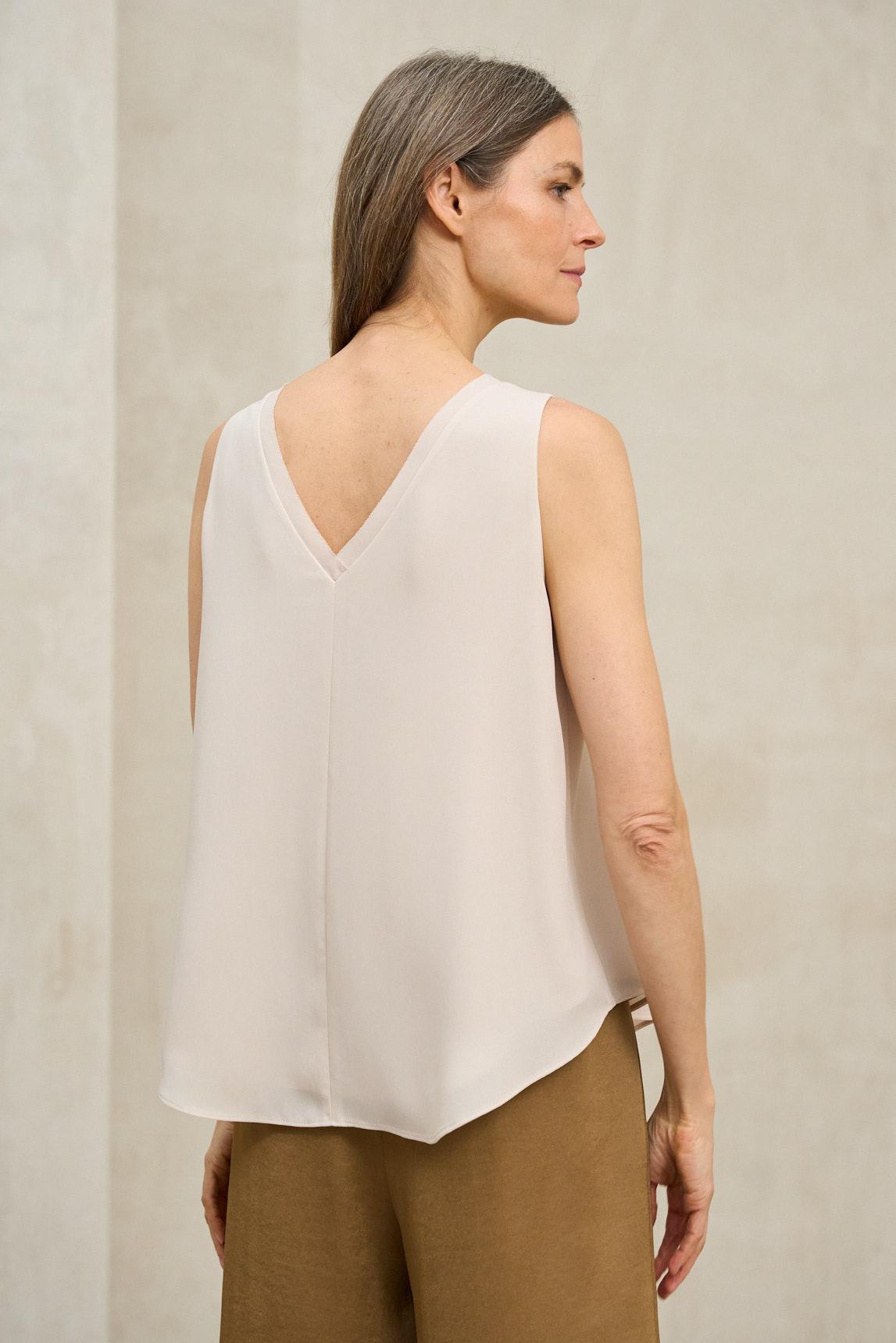 Este top sin mangas presenta una silueta fluida con escote en pico tanto en la parte delantera como en la espalda, creando una línea estilizada y ligera. El tejido muestra una caída suave y continua, con un acabado liso y delicado que aporta movimiento natural a la prenda. El bajo ligeramente redondeado suaviza la estructura y refuerza su carácter relajado, mientras que el corte amplio permite que el top se deslice con ligereza sobre el cuerpo sin ceñirse. En clave de estilo, es una pieza minimalista y versátil, pensada para integrarse con facilidad en el armario diario. Su fit suelto funciona tanto con pantalones de sastrería como con faldas fluidas o denim, aportando equilibrio y frescura. El color crudo potencia la luminosidad del conjunto y realza combinaciones con tonos neutros o contrastes más marcados. Ideal para los meses cálidos o como capa base bajo chaquetas ligeras, este top transmite sencillez refinada y comodidad. Se lleva con naturalidad y se convierte en un básico esencial para construir looks claros, elegantes y atemporales. Nos esforzamos por mostrar los colores de la forma más fiel posible, pero pueden variar ligeramente respecto a la realidad.