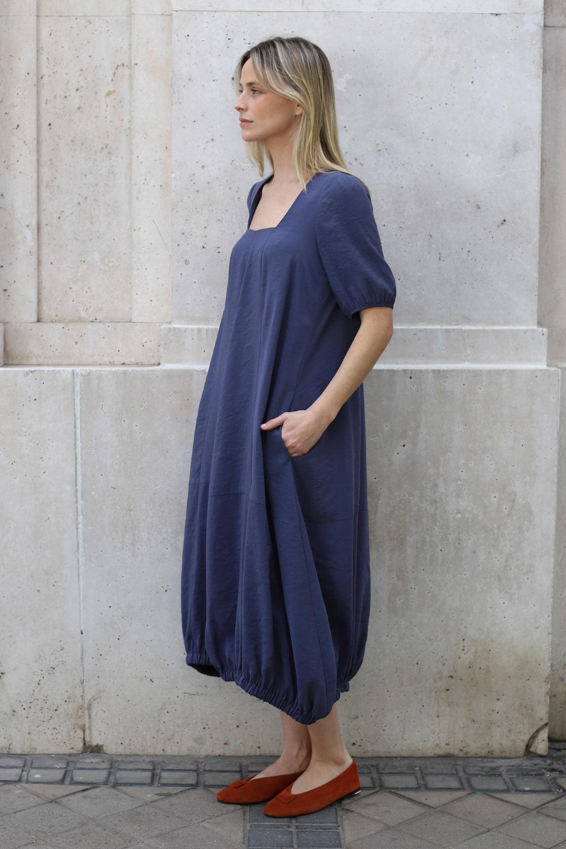 Vestido de mujer en color azul medio con escote cuadrado, manga corta amplia y silueta de volumen suave. El diseño presenta una línea limpia que cae con naturalidad desde el cuerpo y se recoge en un bajo globo con elástico, creando una forma envolvente, actual y muy favorecedora. Los bolsillos laterales integrados refuerzan su funcionalidad sin alterar la estructura depurada de la prenda, mientras la superficie lisa aporta una imagen serena y contemporánea.