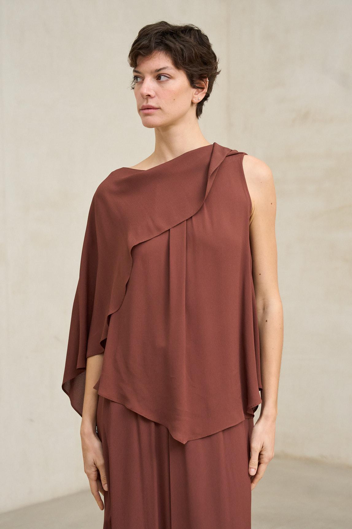 La Blusa Támara terracota es una pieza fluida y sofisticada que destaca por su diseño relajado y su silueta envolvente. Confeccionada en un tejido ligero de caída suave, presenta escote barco y manga amplia tipo capa que aporta movimiento y un aire contemporáneo al conjunto. Su diseño incorpora una capa frontal superpuesta que genera volumen y profundidad visual, estilizando la figura sin marcar. El tono teja, cálido y favorecedor, refuerza su carácter elegante y la convierte en una prenda ideal tanto para ocasiones especiales como para estilismos más relajados combinada con pantalones amplios o faldas fluidas. La Blusa Támara terracota es una opción versátil dentro del armario femenino: cómoda, ligera y con un diseño diferencial que eleva cualquier look sin esfuerzo. Nos esforzamos por mostrar los colores de la forma más fiel posible, pero pueden variar ligeramente respecto a la realidad.