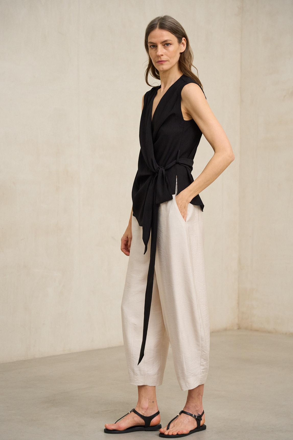 La Camisa Zarev negro interpreta el diseño cruzado en clave más sofisticada y rotunda. Su escote en pico y su estructura envolvente definen la silueta con equilibrio, mientras que la lazada lateral genera un efecto fluido y estilizado. El tejido ligero aporta movimiento sin rigidez, creando una caída elegante que funciona tanto en estilismos de día como en propuestas más formales.