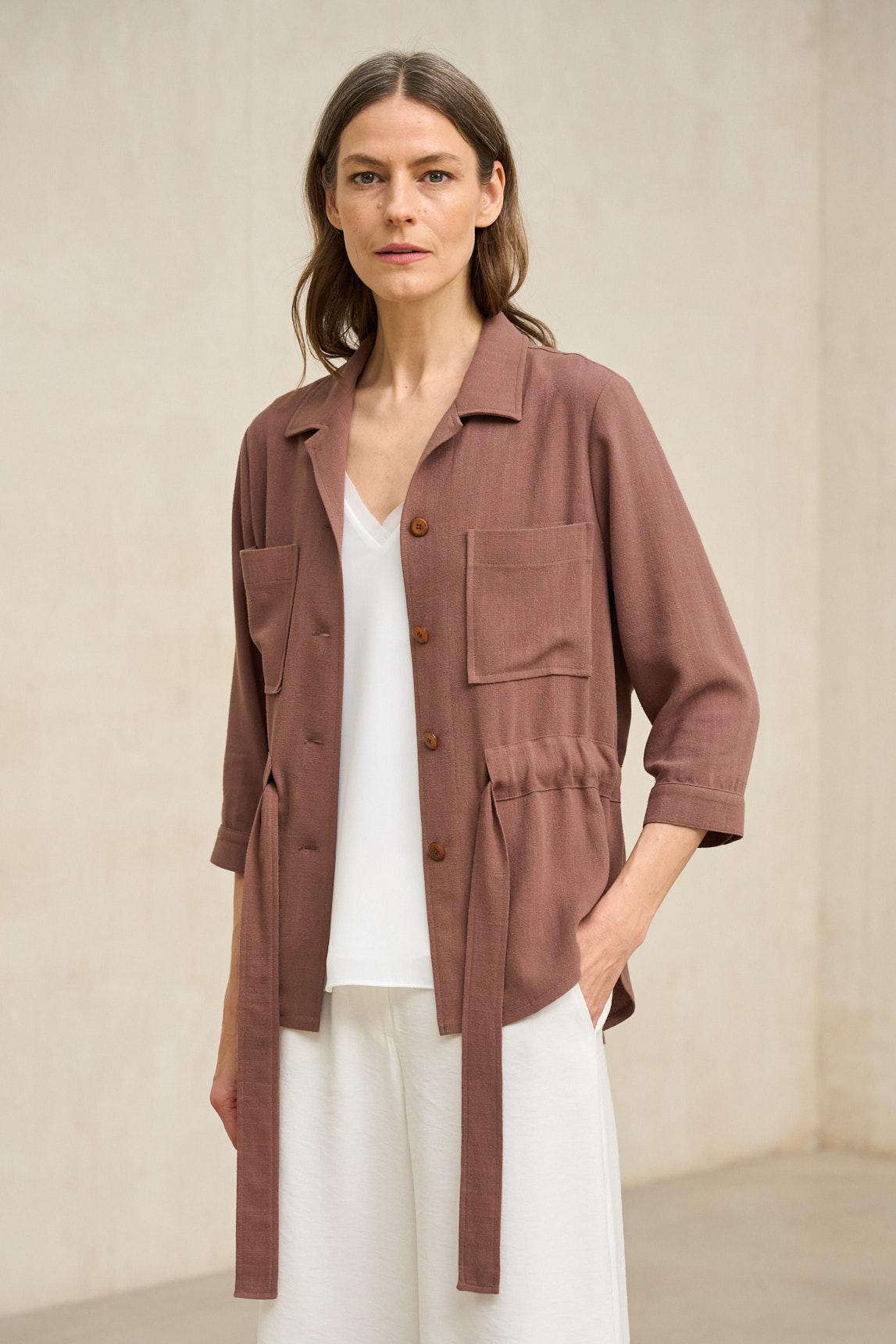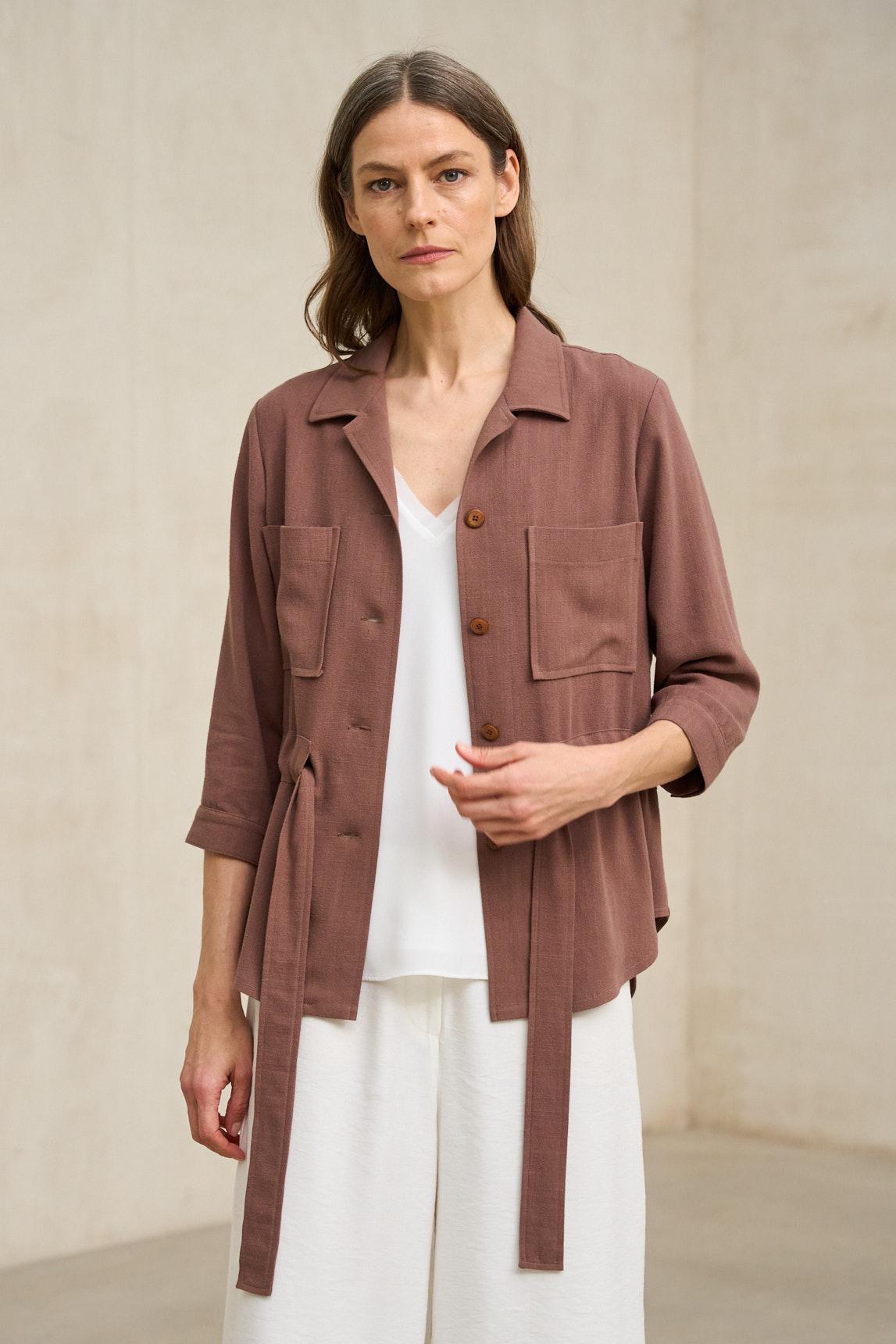 Chaqueta de mujer confeccionada en tejido ligero de tacto natural y acabado suave. Presenta cuello camisero, cierre frontal con botones y bolsillos de plastrón en el pecho que aportan funcionalidad y estructura. Incorpora cinturón del mismo tejido para ajustar la silueta y definir la cintura con un aire relajado y femenino.