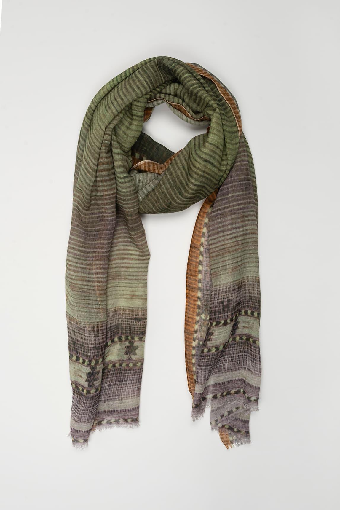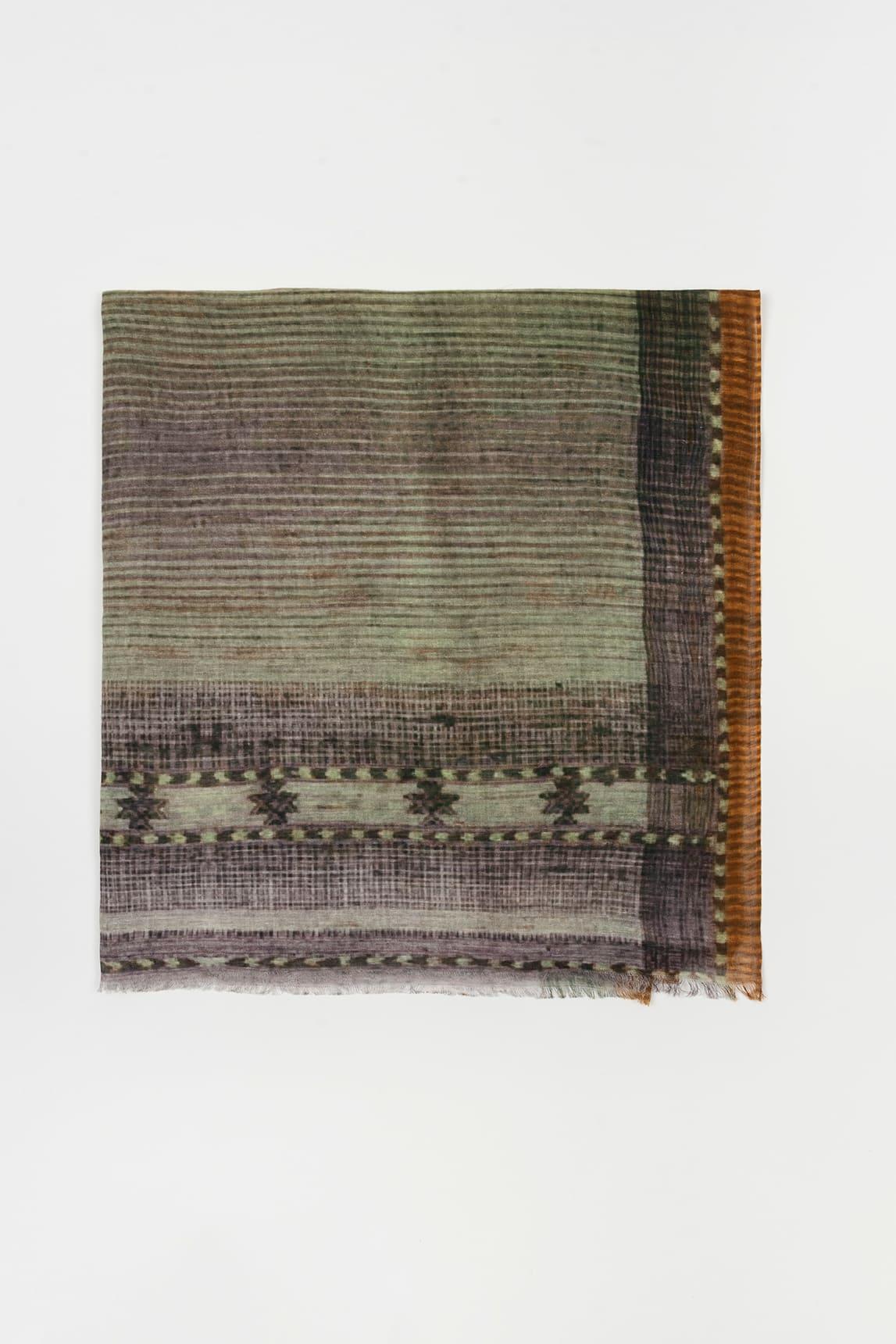 El fular Zafren Verde destaca por su composición en tonos verdes suaves con matices tierra y pequeños acentos cálidos que aportan profundidad al diseño. Su estampado combina texturas orgánicas y trazos irregulares que evocan un paisaje natural reinterpretado en clave artística.