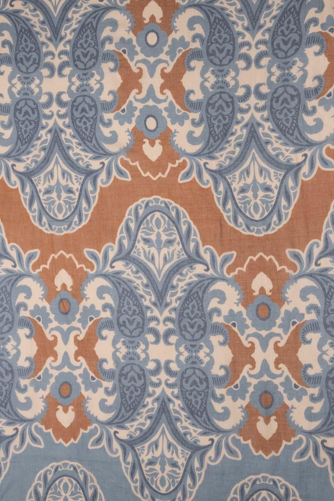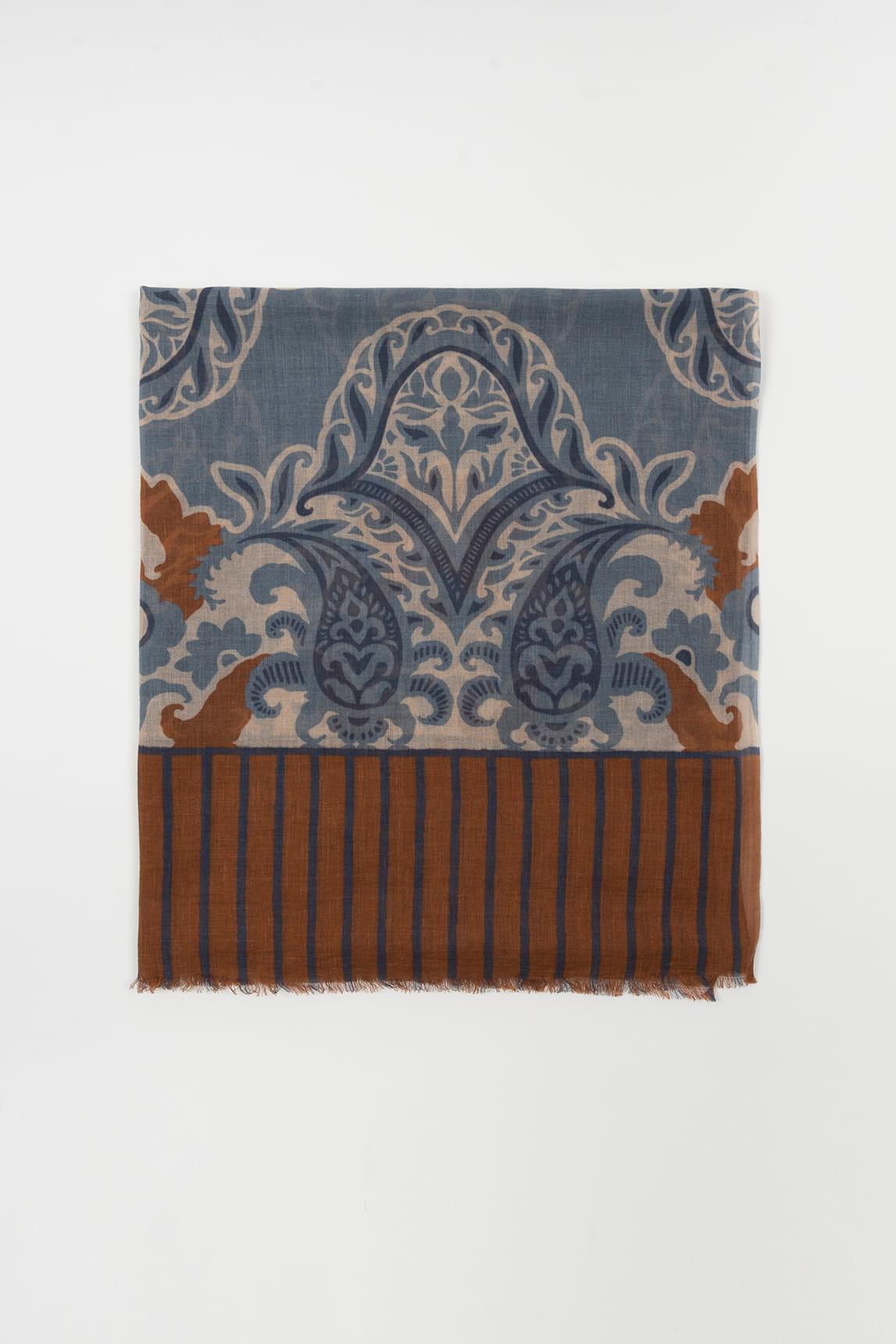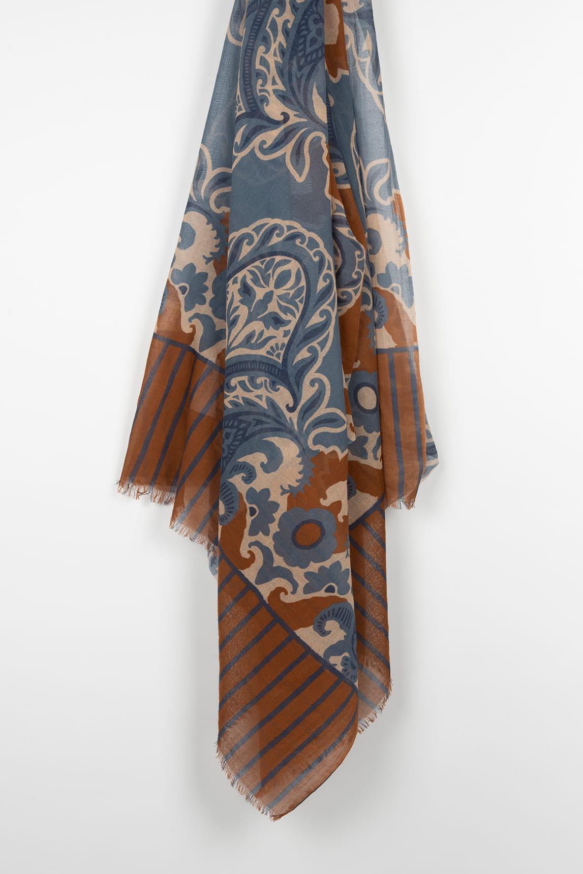 El Fular Zairel azul terracota destaca por su estampado ornamental de inspiración artística, donde se combinan motivos orgánicos en azul empolvado con detalles en terracota y matices cálidos. El contraste cromático aporta profundidad visual sin perder armonía.
