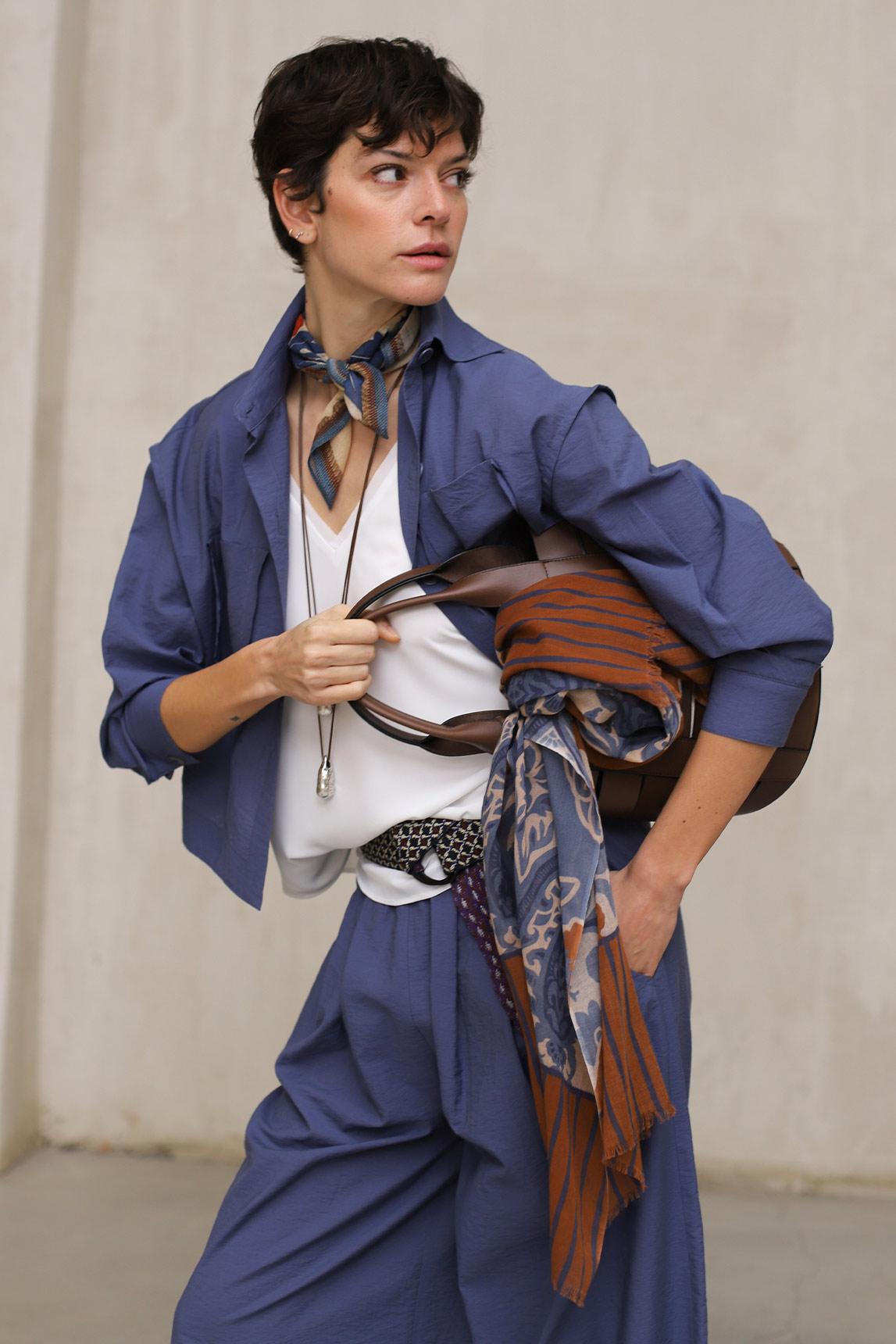 La combinación de azul y terracota facilita integrarlo en estilismos neutros, arena, crudo, camel o denim, aportando un punto de color equilibrado y sofisticado.